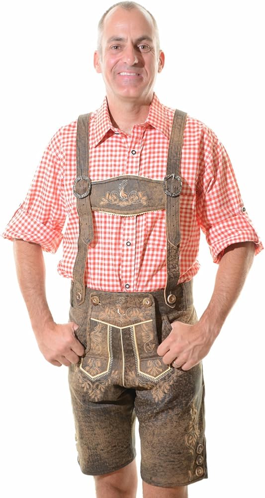Our JODLER Lederhosen can for sure be called the Ferrari of all German lederhosen. The material used on these lederhosen shorts is finest lamb leather in an antique brown color. The leather has run through multiple tanning processes, which gave this German costume an amazing two color tone antique look. The appearance is antique, but the touch and feel are the smoothest and softest you will ever have felt on lamb leather. Nevertheless they are still robust and meet the requirements of a traditional pair of German lederhosen. Handcrafted floral designs combined with deers exemplify the Bavarian lederhosen tradition, which will make it especially appealing for the younger lederhosen generation. The lederhosen aficionado will be very happy with this top of the line tracht product. The H-suspenders are included, but you can wear the JODLER lederhosen with our without the suspenders. Both ways are a clear fashion statement to the Bavarian trachten world and you are showing class and style, wearing the highest quality possible.