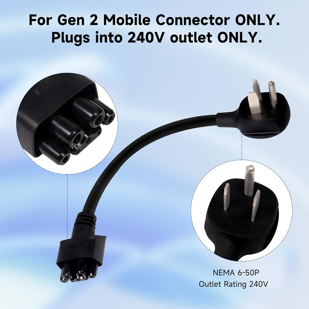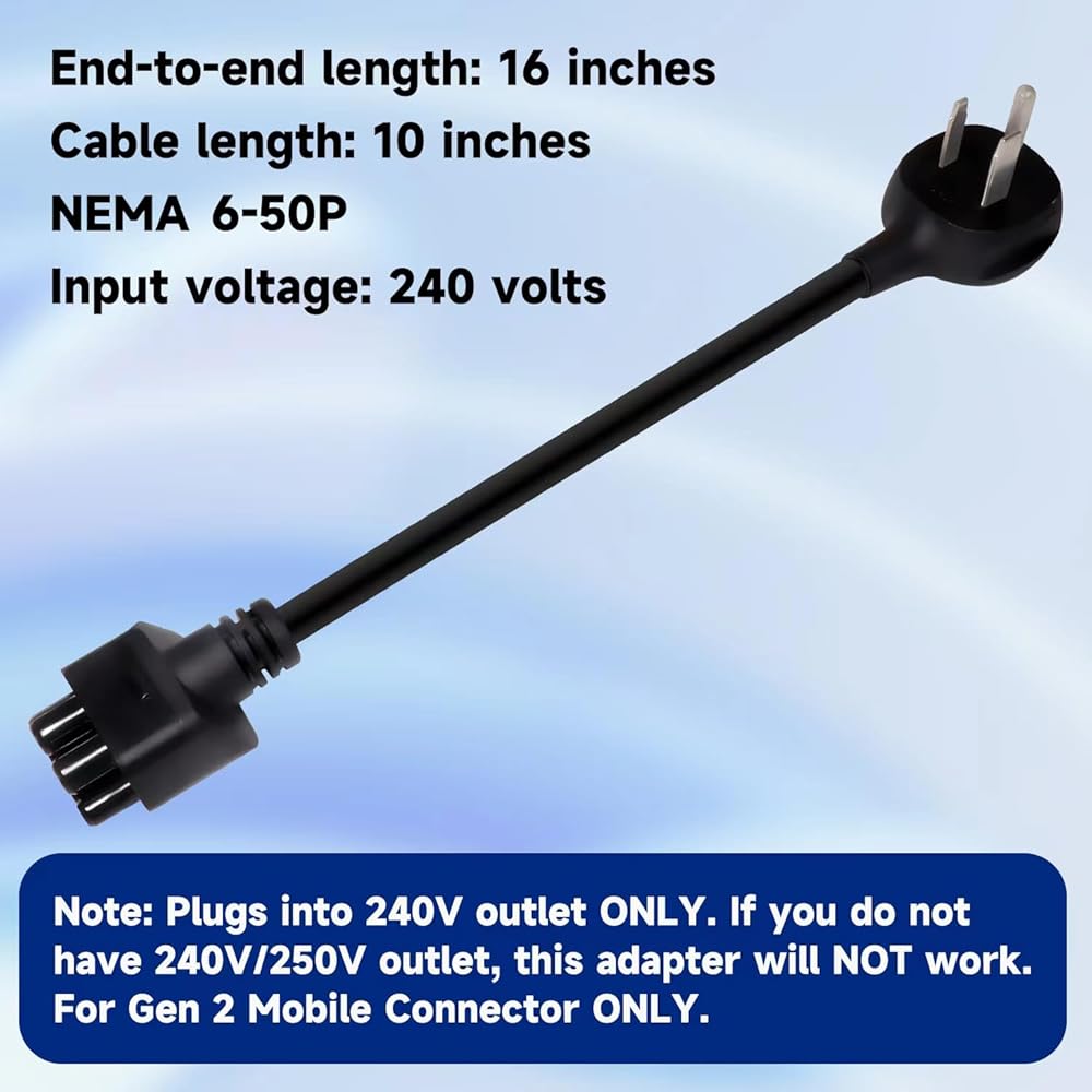Fitment: For Gen 2 Mobile Connector ONLY. Plugs into 240V/250V outlet ONLY. Note: If you do not have 240V/250V outlet, this adapter will NOT work