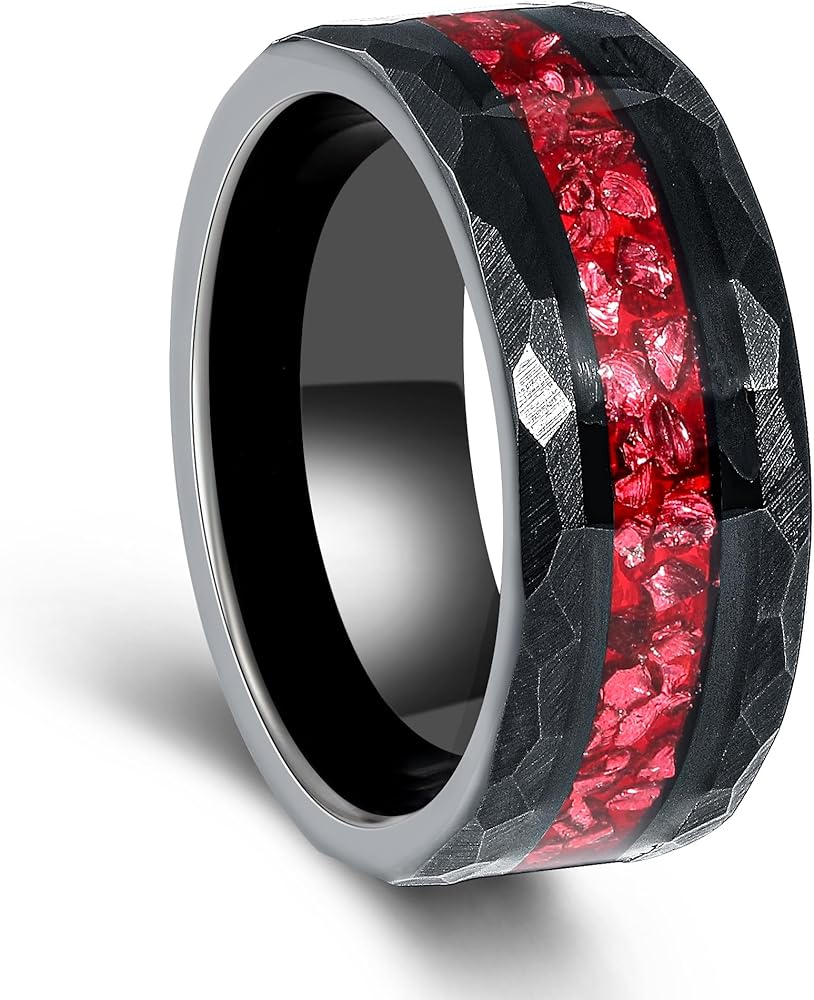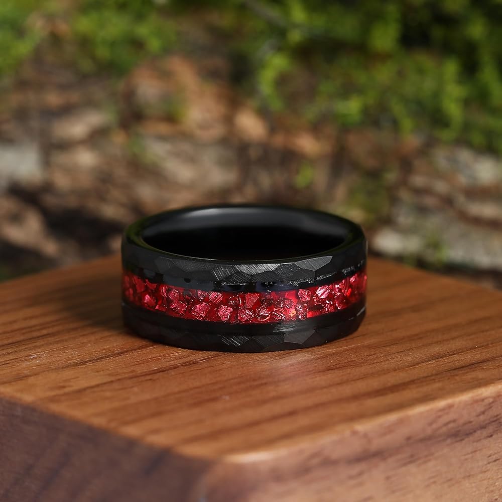 Designer's words: Black & Red have been the best symbolic colors for men since ancient times - representing men's steadiness, bravery, passion, dignity, strength, flamboyance and vitality. Inspired by this, we used the processes of plating black gold and setting created ruby to make this premium tungsten carbide ring, with a hammered surface design, making it more powerful. The highly saturated red-black color scheme makes it a great piece of jewelry to express the wearer's personality