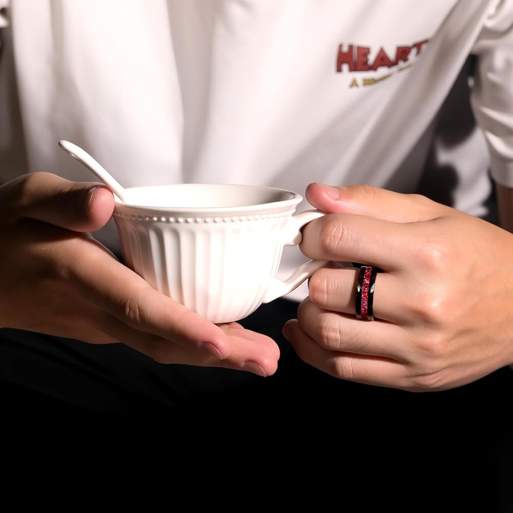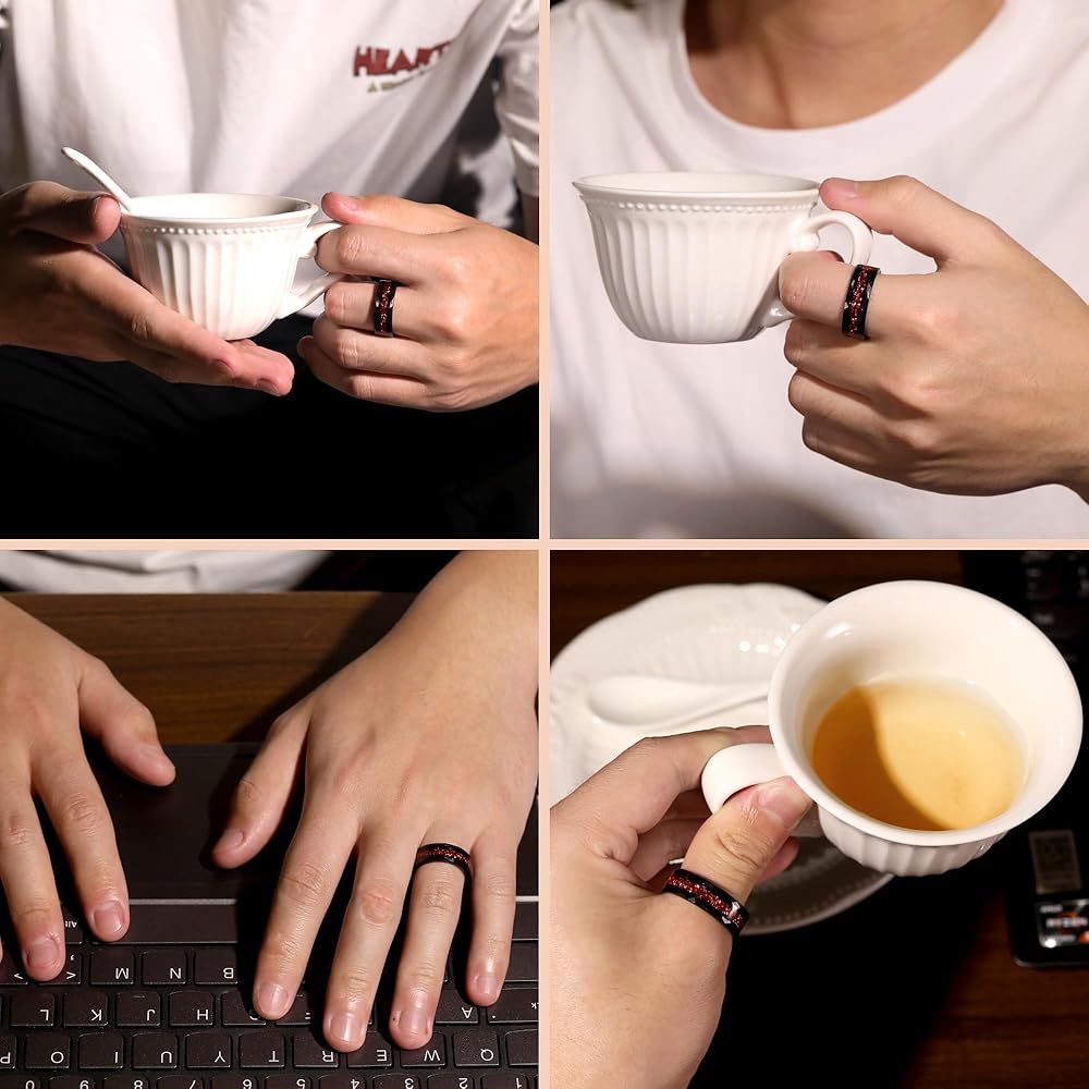 Ring Material: The ring is primarily made of Tungsten Carbide (Tungsten Steel). High Quality Tungsten makes it durable, weighty, anti-scratch and hypoallergenic. With Hammered Process, the face of the ring is plated with high quality 18K Black Gold. Even with prolonged wear, the ring retains its original luster, remaining smooth and shiny for a long time. You can wear it comfortably for extended periods without worries