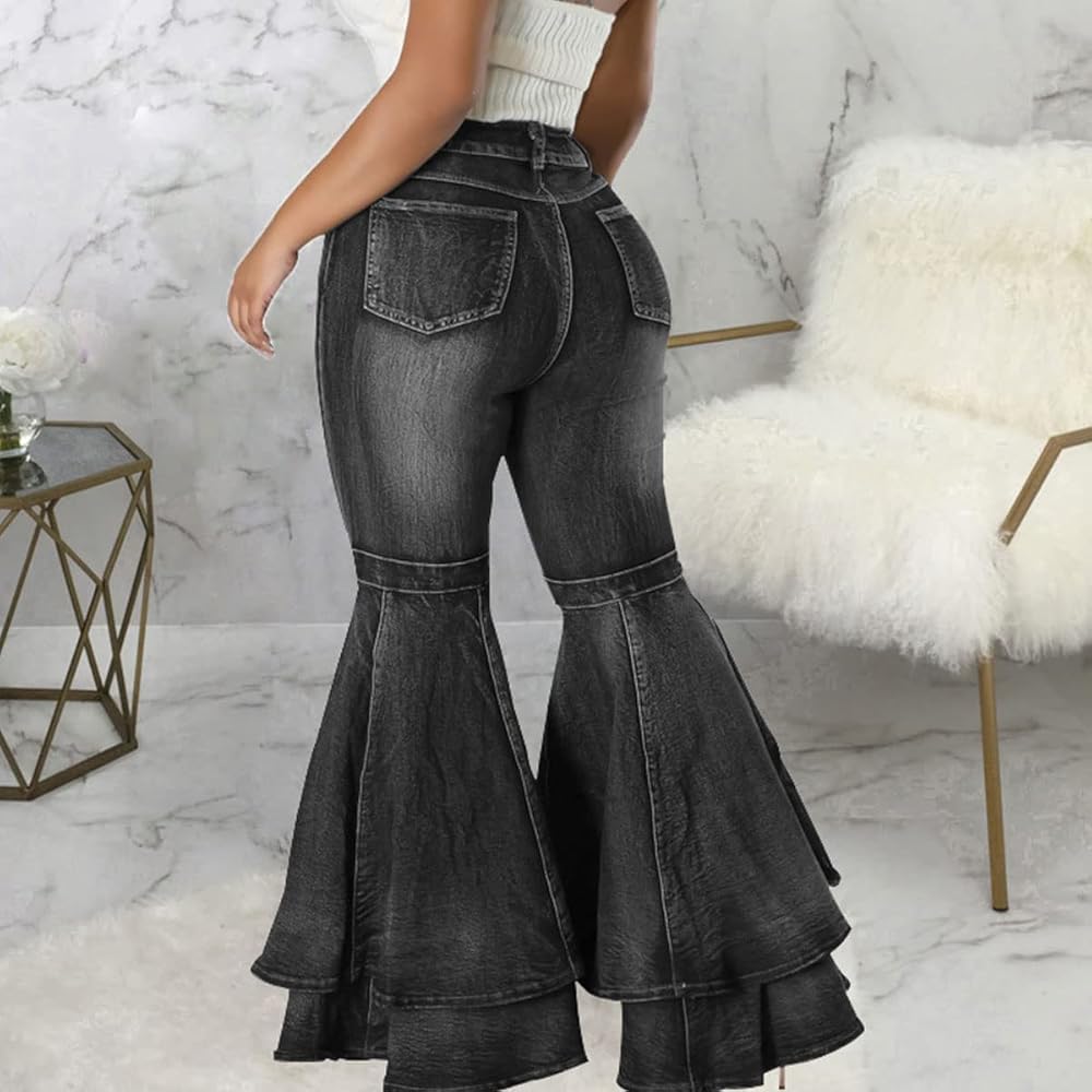 Feature: Bell bottom jeans for women, skinny flare jeans, layered ruffle hem denim pants, bodycon long pants, patchwork pleated ruffle design. Casual denim jeans to highlight the leg line, elongated proportions and highlights your charming figure, while creating a slimmer, sexy elastic high waisted flare jeans for women.