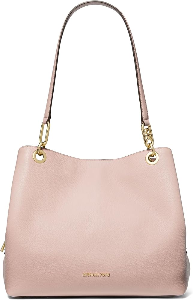 Triple compartment shoulder bag with magnetic snap closures and center zip compartment, solid embossed pebble leather, shoulder drop 10.5 inches