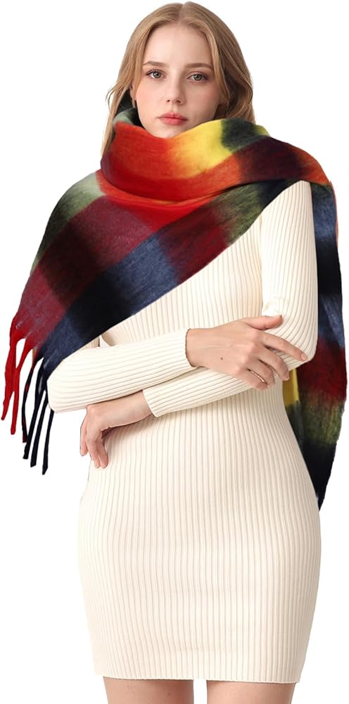 MATERIAL: Large colorful thick women's winter scarf is embellished with tassels, soft and perfect touch. Winter warm scarf, made of high quality acrylic, cashmere feel comfortable, skin-friendly and lightweight, no pilling. The fabric is soft, cozy and non-irritating, giving you a wonderful feeling.