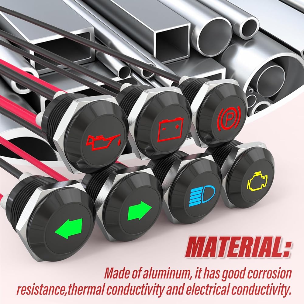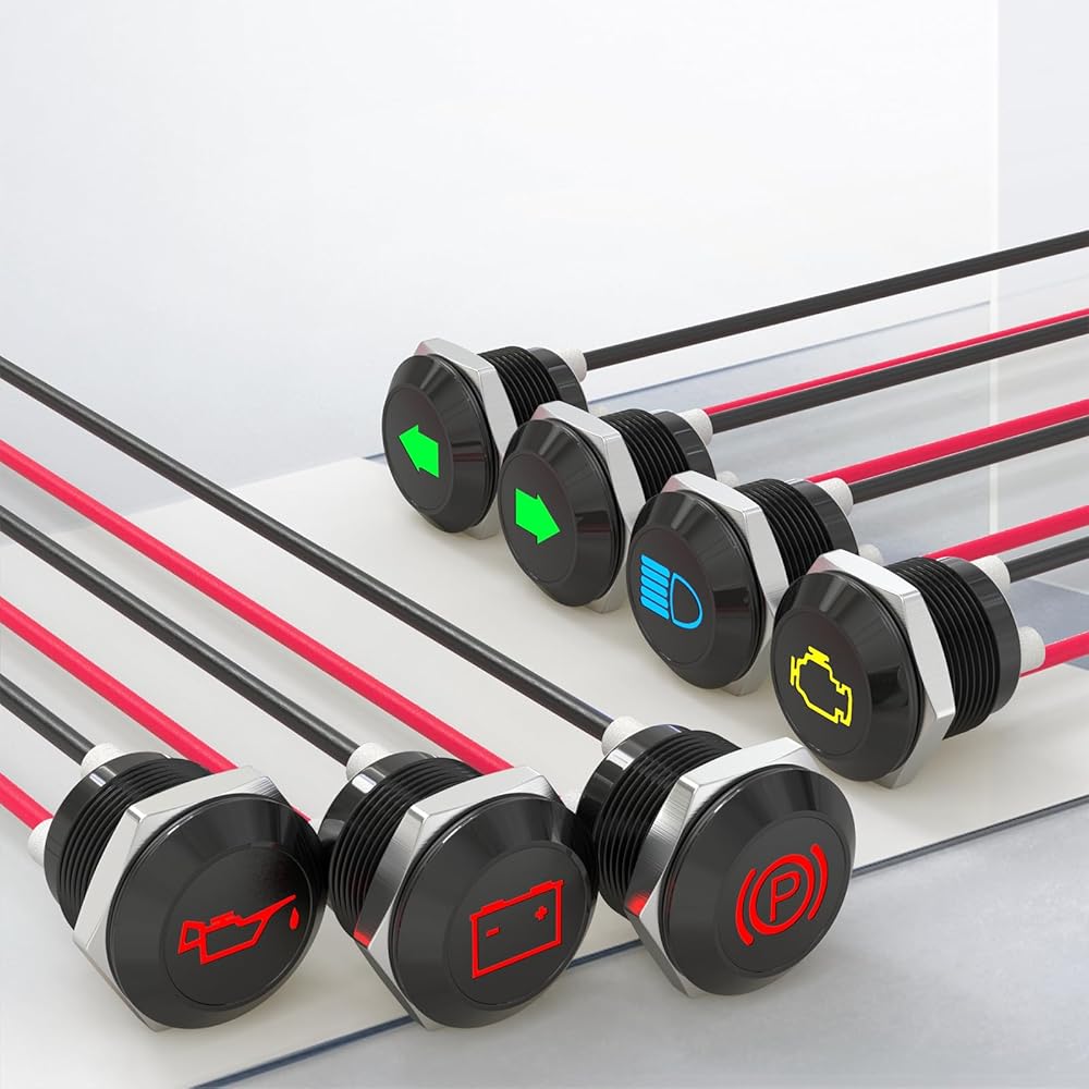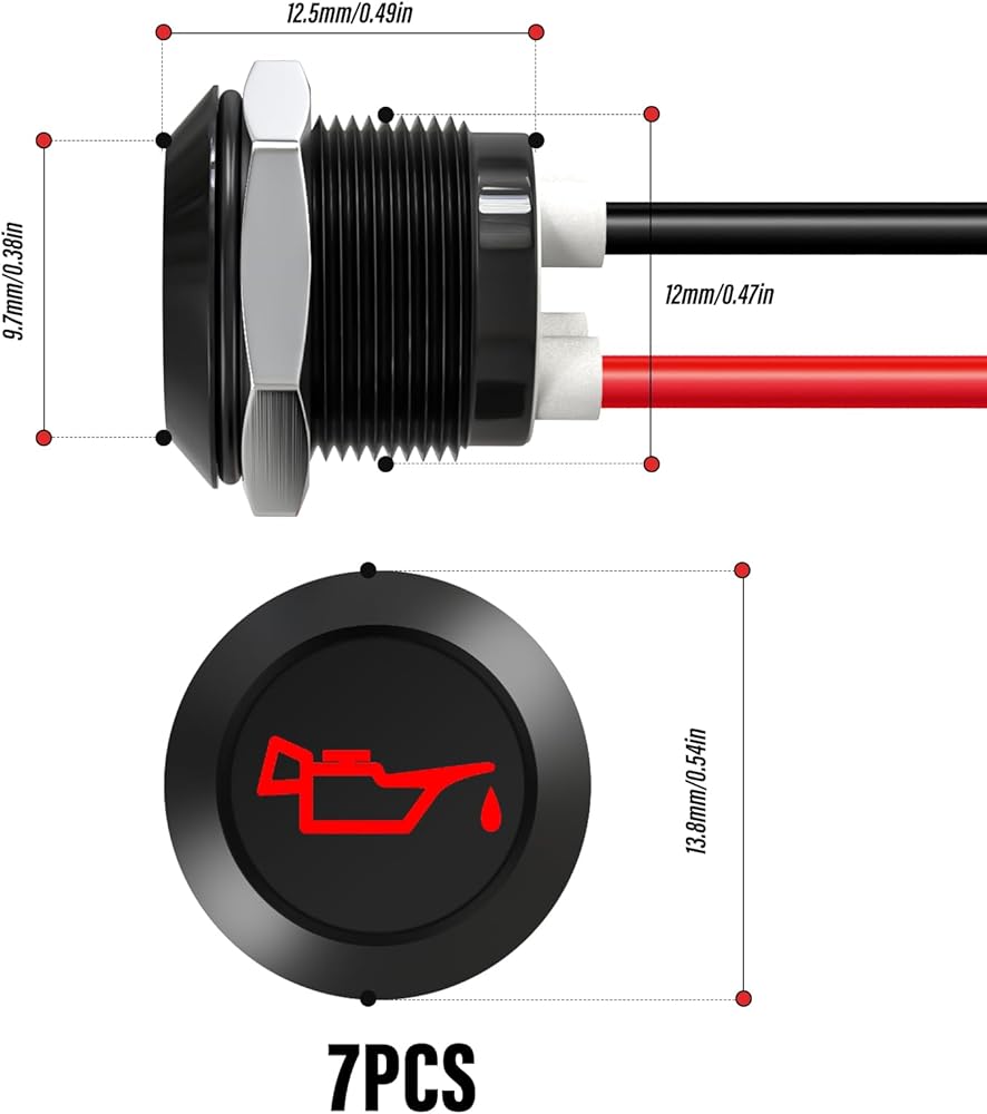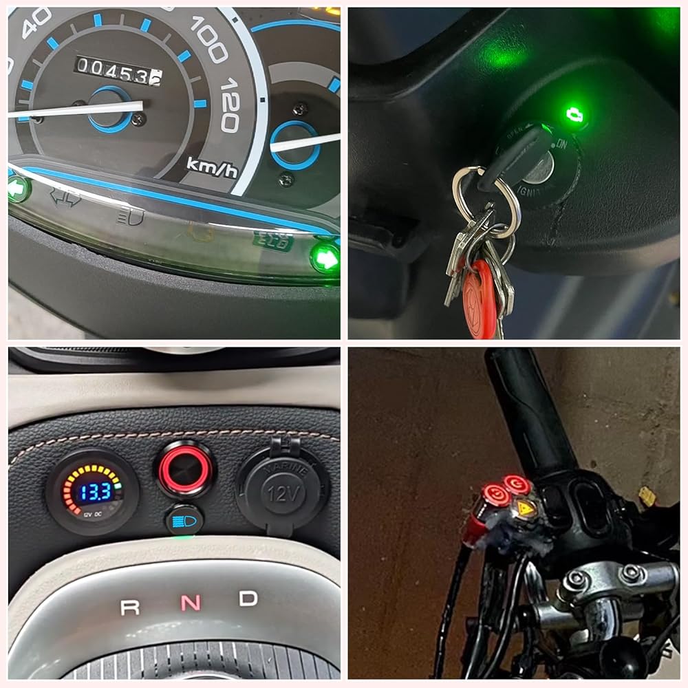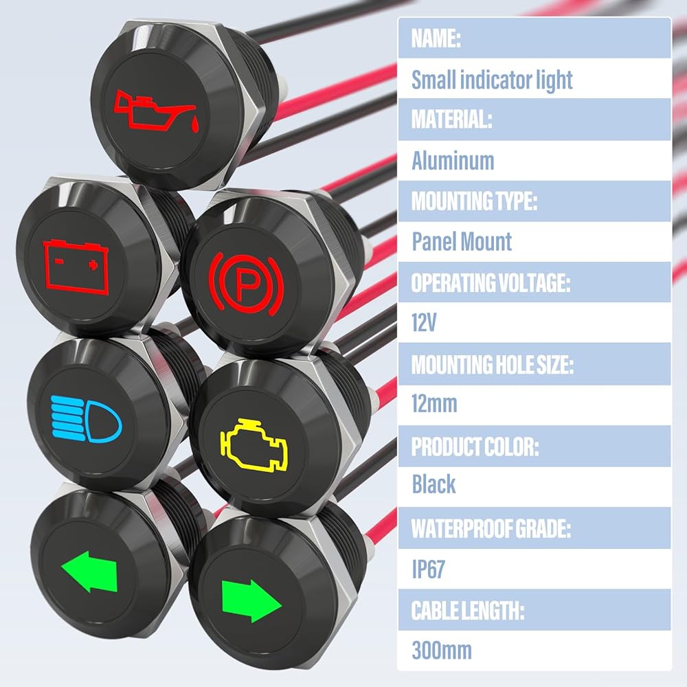 🛒Packing list: 1 green left-turn signal indicator, 1 green right-turn signal indicator, 1 yellow check engine indicator, 1 blue high beam indicator, 1 red battery warning indicator, 1 red low oil pressure indicator, 1 red parking brake indicator, 7 indicators in total