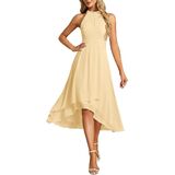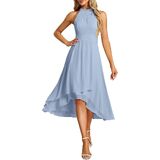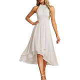 A gorgeous dress designed with a halter neck, ruched high waist, and a dramatic high-low ruffle hem. The shimmering material adds a touch of glamour, making it an excellent choice for wedding guests.