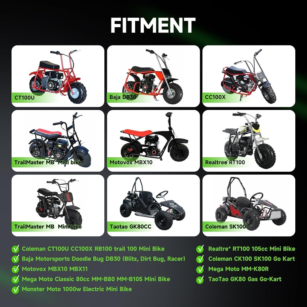 Fitment: #35 Chain Sprocket 40 Tooth compatible with 97cc 98cc 100cc 2.5hp 2.8hp 3.0hp Coleman CT100U CC100X RB100 trail 100 mini bike, Coleman CK100 SK100 go kart, Baja Motorsports Doodle Bug DB30 ( Dirt Bug,Blitz, Racer), Motovox MBX10 MBX11, Mega Moto Classic 80cc MM-B105 MM-B80 mini bike, Monster Moto 1000w mini bike, Realtre* RT100 105cc mini bike, Mega Moto MM-K80R, TaoTao GK80 gas go-kart