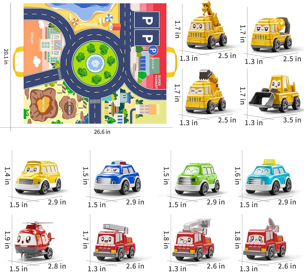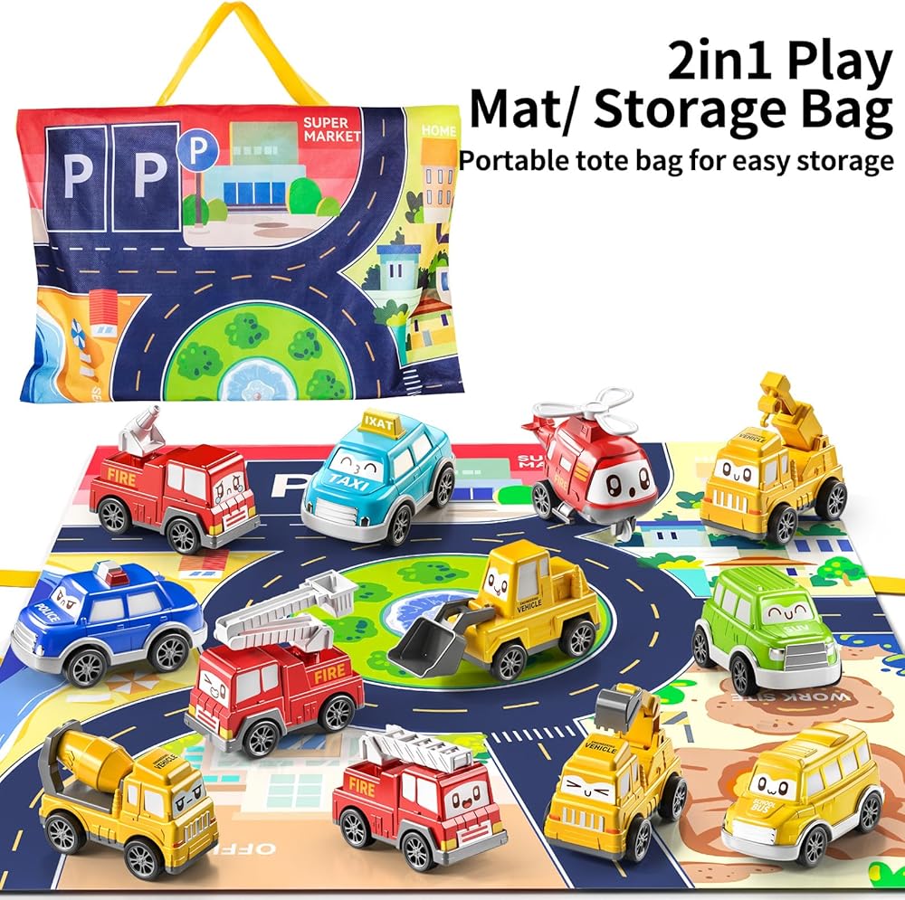 2 in 1 Play Mat/Storage Bag - The push and pull cars for toddlers includes city street map,Kids can sit on a simulated urban traffic scene, let their imaginations run. It also folds up into a storage pouch, making it easy to fit any toy car into. which can cultivate a kid's storage ability and easy-to-carry.