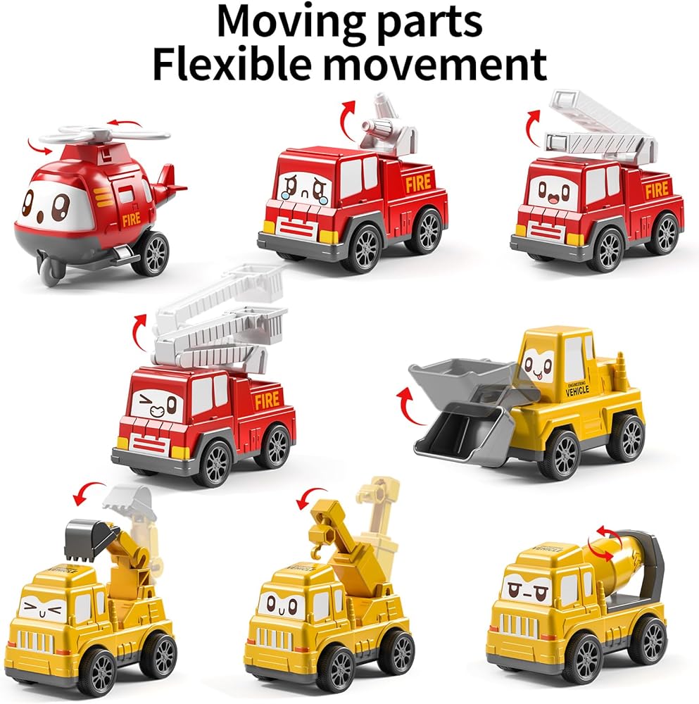 Pull Back Cars for Toddlers 1-3 - No need batteries, friction powered for fun and handy vehicles toy set for kids. These toy cars feature functional parts,all you need to do is just pull the car back and it will move forward,easy to play and applicable up to 12 months and above, suitable for 1 2 3 year old toddlers.