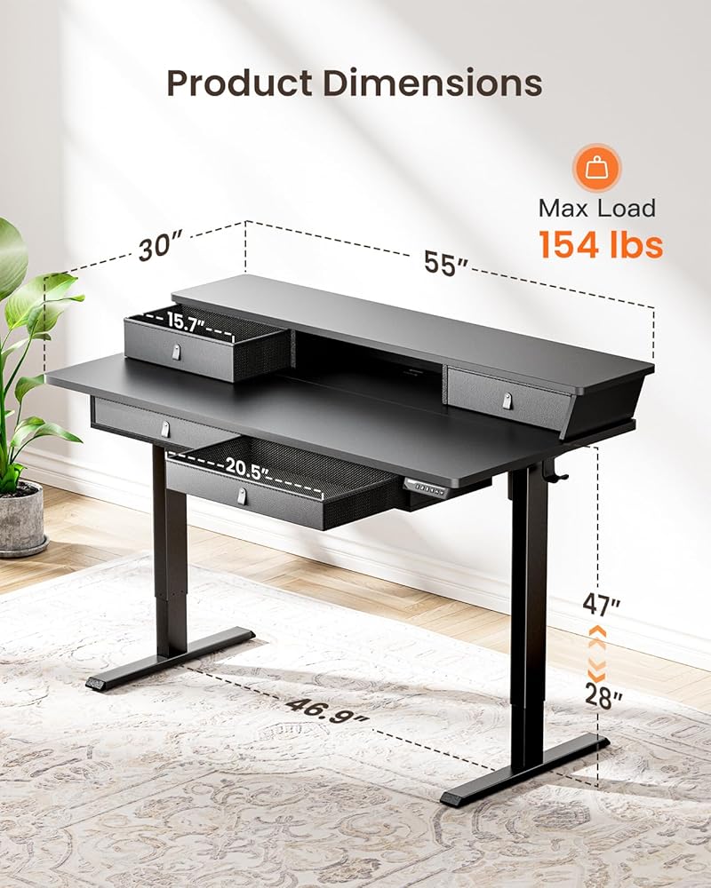 【4 Memory Customizable Height】Our home office standing desk features a height range from 28.3″ to 46.5″ with 4 memory preset buttons for easy transition between your favorite work heights. This electric standing desk with drawer supports up to 154 lbs and operates with noise levels ≤ 50 dB.