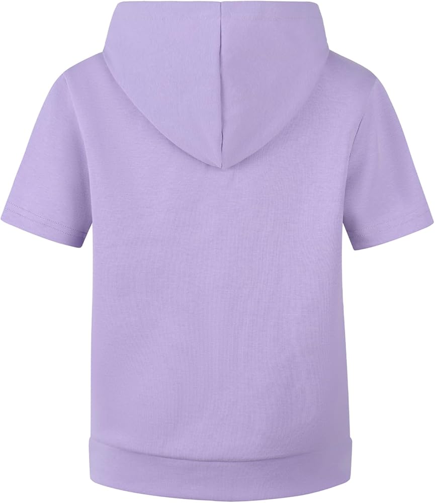 - Short sleeve hoodie, full zipper closure, front pouch pocket, hood with no drawstring, soft material on hem for a more comfortable fit