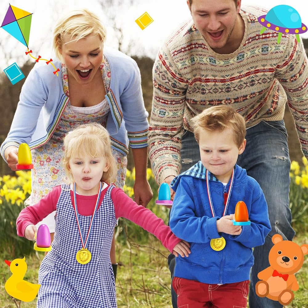 Funny Outdoor Game Set: the package contains 70 pieces outdoor party games set, come with 8 pieces potato sack race bags, 8 sets of egg spoon racing game sets, 8 pieces of 3 legged race bands, 8 pieces plastic golden medals, 1piece tug of war rope, 16 pieces colorful rings, 8 pieces bean bags, 8 pieces safety cones, 1 piece black mesh bag, 1 piece flag, 1piece center line and 2 pieces plastic pegs; Different types of game for kids to play and enjoy, all fun in one package