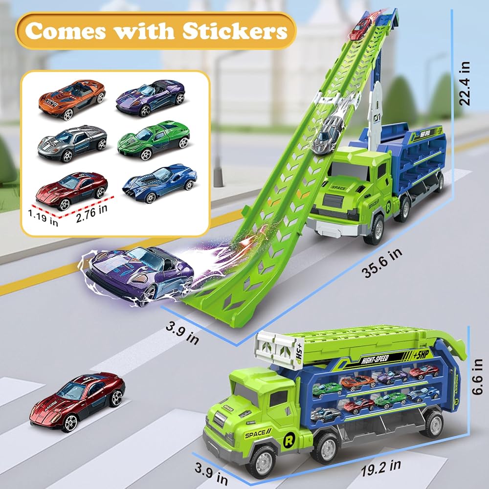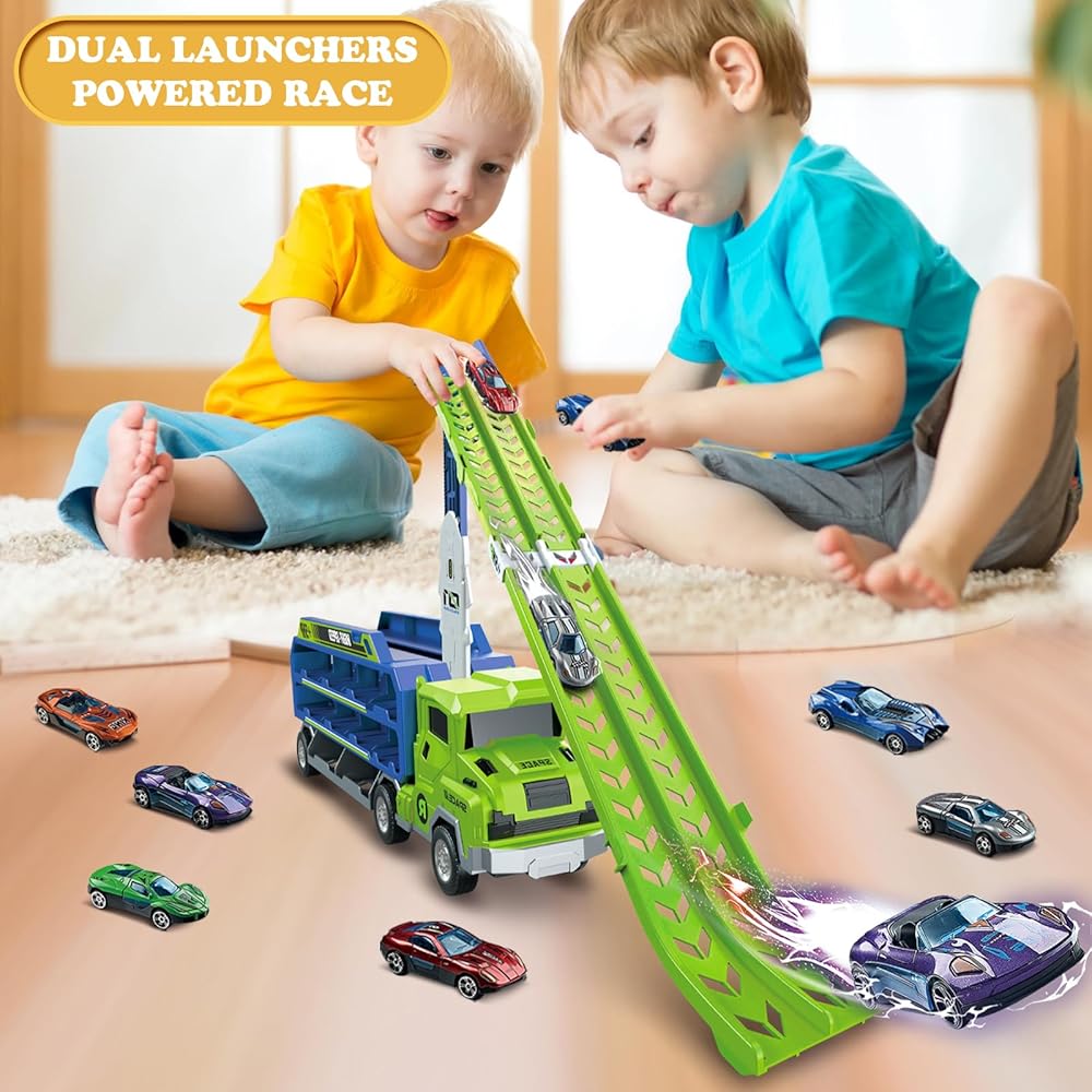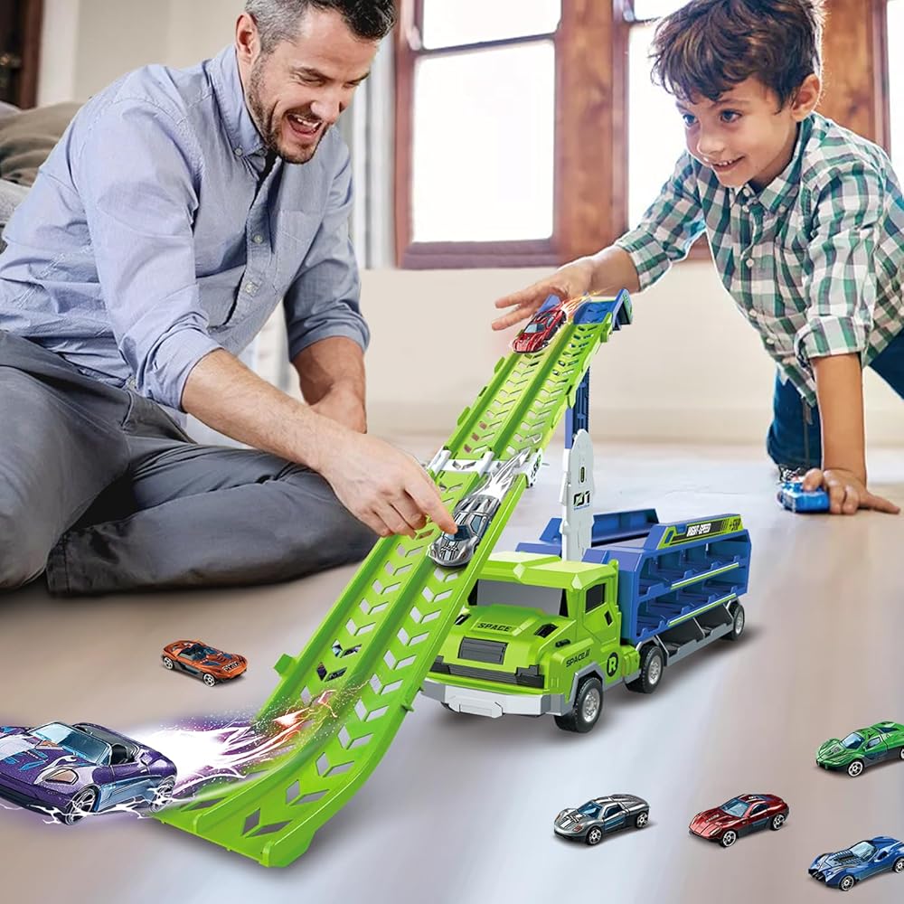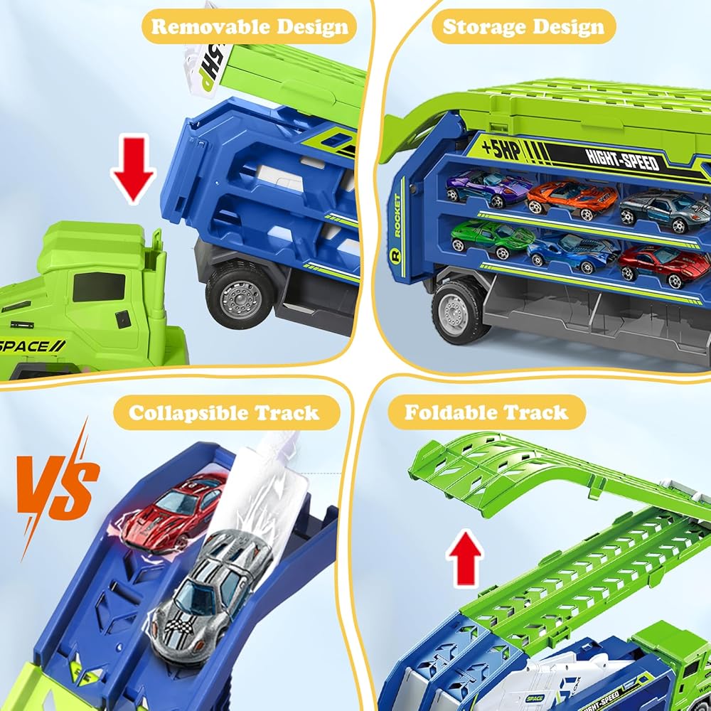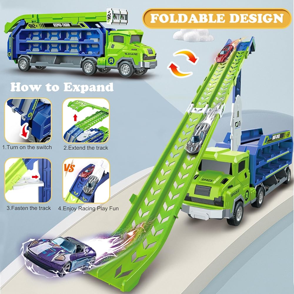 【 Foldable Track Design for Easy Setup & Storage】Featuring a collapsible design with a 2.8-FT double-row launch track, simply unlock the latch on the back of the carrier truck race track kids toys to easily create a long enough track suitable for single or multiplayer races. Not only does foldable track carrier truck provide a thrilling racing experience, but it is also easy to store, making it an ideal choice for family entertainment.