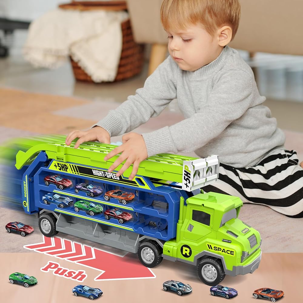 【 Ideal Gifts for 3 4 5 6 Years Old Kids】This car carrier toy is made of high quality materials, non-toxic, and odourless, ensuring the safety of kids while playing. The smooth, burr-free surface design protects children's small hands from harm, allowing parents to let their children play with peace of mind. This car carrier truck toy makes an ideal birthday, Christmas or other holiday gift for boys girls aged 3 4 5 6 7 8 9 10 11 12.
