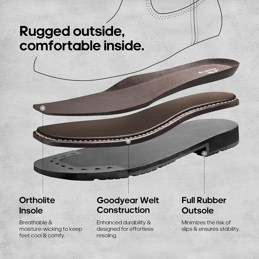 Reliable Durability: Engineered with Goodyear welt construction, these men's work boots excel in durability, sturdiness, waterproofing, and longevity. The full-grain leather upper, combined with an oil- and slip-resistant rubber lug outsole, ensures exceptional grip and long-lasting wear.