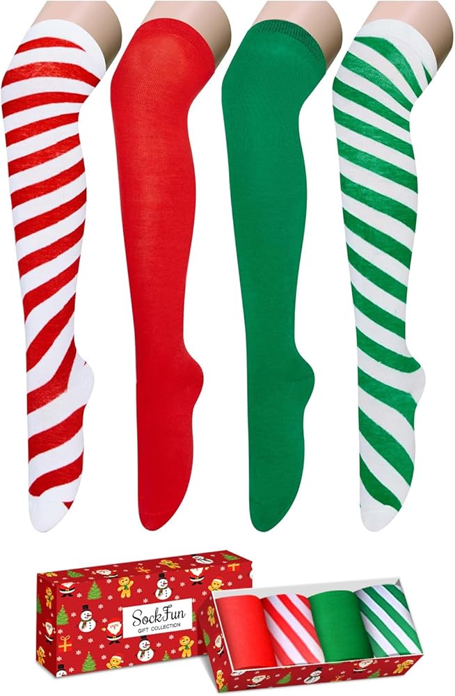 HALLOWEEN THIGH HIGH SOCKS: Bring out all your favorite skirts and dresses with these over-the-knee socks. They come in orange with stripes, white with stripes, purple with stripes, and green with stripes. These stylish thigh-high socks are the best choice for a spooky socks collection.