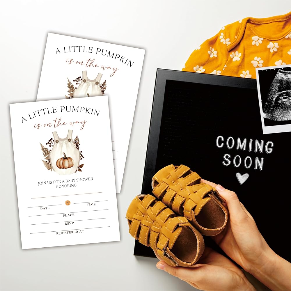 25 Set Double Print Baby Shower Invitation Cards(4"x6")-A Little Pumpkin Is On The Way Autumn Card-Clothes With Pumpkin Invitation Card With Envelope-Baby Gender Announcement-A10