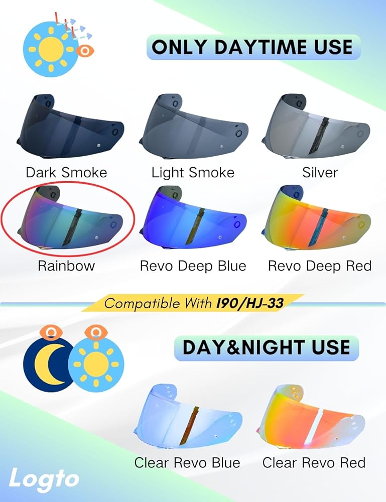 MULTIPLE COLORS: Choose your motorcycle helmet visor tint. Available day and night use: Light Smoke, Clear Revo Red, Clear Revo Blue; Only daytime use: Dark Smoke, Sliver, Rainbow, Revo Deep Red, Revo Deep Blue