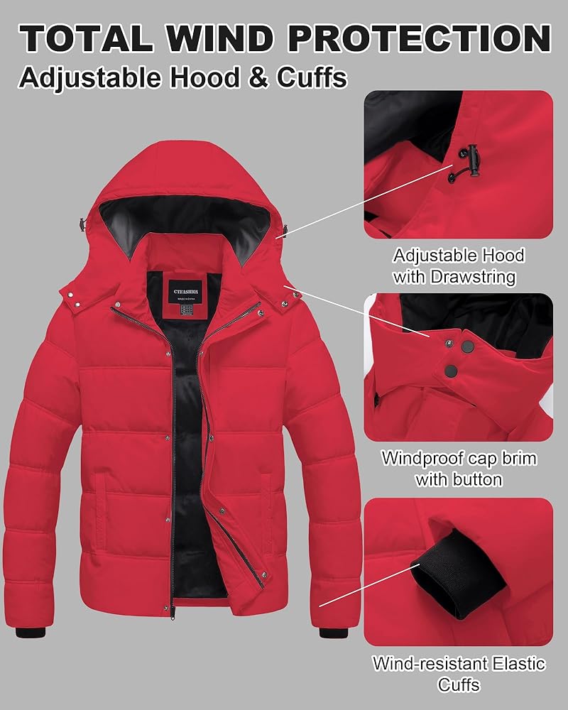 Windproof winter coat--high quality sbs zipper, detachable hooded with adjustable drawstring, stretch cuff to protect you in the winter months.