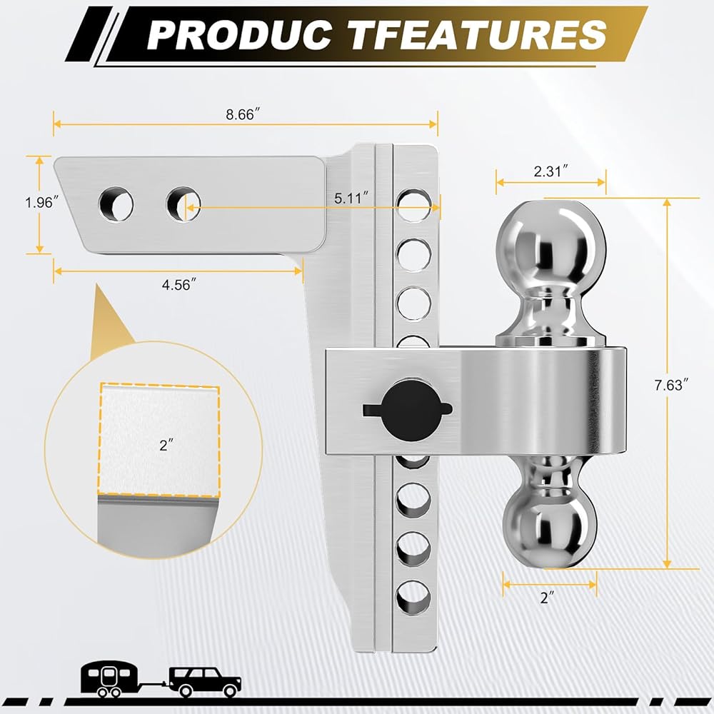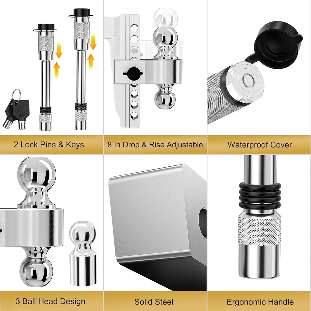 【Adjustable Trailer Hitch】Our adjustable trailer hitch comes with 2-inch, 1-7/8-inch and 2-5/16-inch ball mounts and is easily adjusted to support a wide range of hitch heights ( and the maximum drop/rise height is 8 inches). Our adjustable design allows for seamless height adjustments, ensuring a ideal fit for your vehicle and trailer. No more wobbling or strain - just smooth sailing on the road ahead.