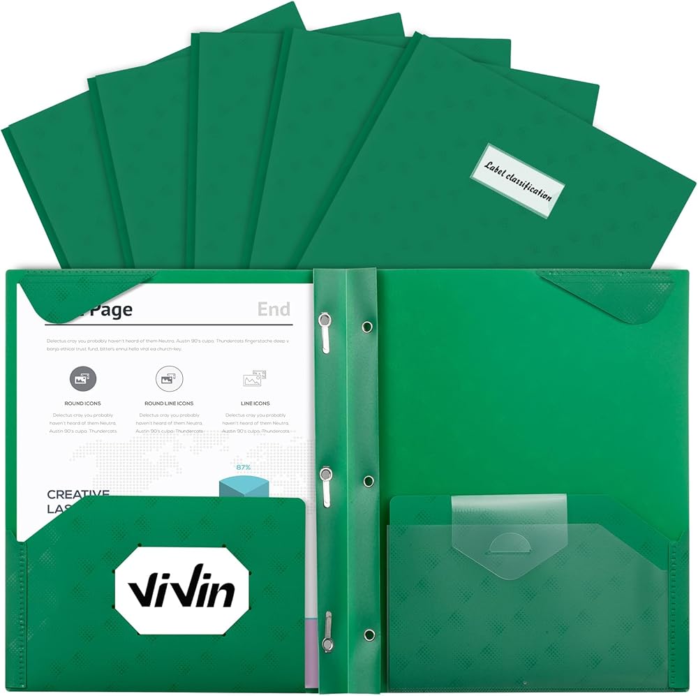 ViVin 6-Pack Green Plastic Folders with Pockets, Heavy Duty 3 Prong Folders with Labels and Interior Pocket, Poly 2 Pocket Folders for School, Office, and Home