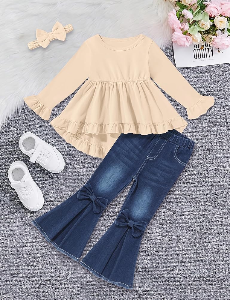 【Elegant Design】Toddler girl clothes set is featuring a pure color top with a classic round neck and long sleeves, enhanced by delicate ruffles at cuffs and hem. Bell-bottom jeans adorned with a bow, coupled with a high-elastic waist for ease and style, plus a matching headband.