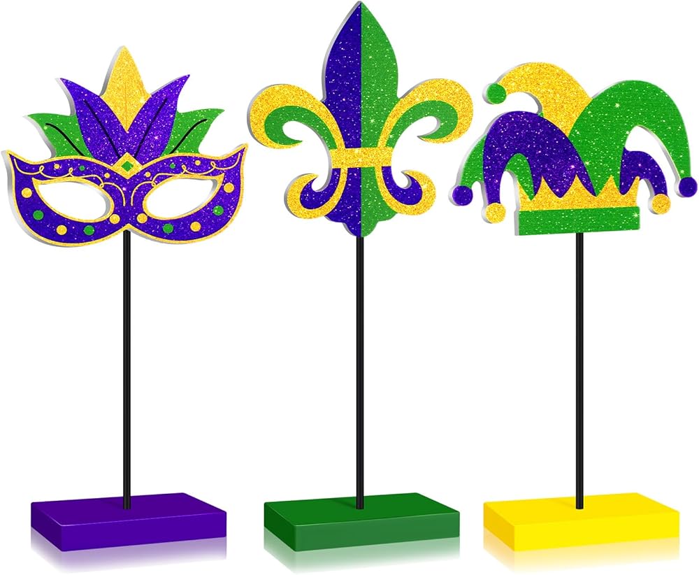 Huwena 3 Pcs Mardi Gras Centerpieces for Tables Mardi Gras Standing Wooden Table Decor Carnival Tiered Tray Decor Purple Green Gold Decorations for Masquerade Party Home Kitchen Shelf