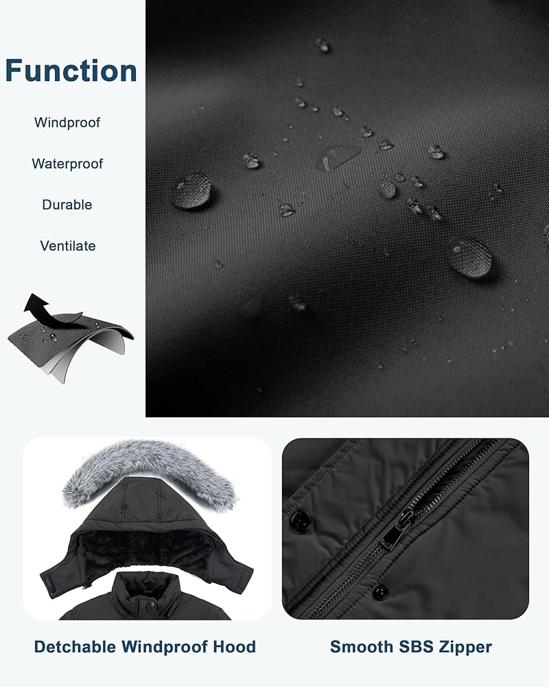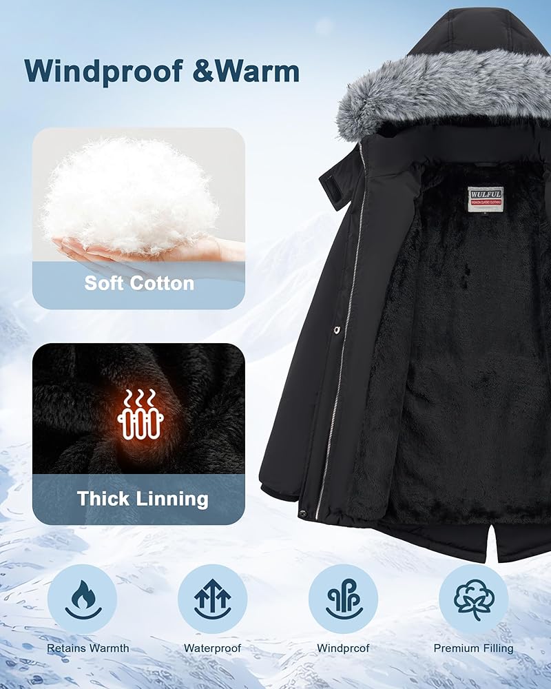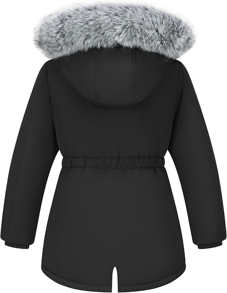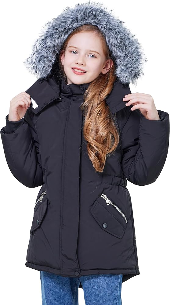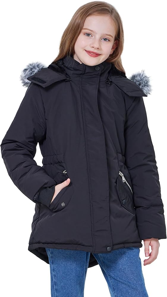 Girl windproof parka:Stand collar design,big detachable hood with fur,ribbed cuff,keep cold wind away.Elastic waistband,locking the heat and make girls more slim fit