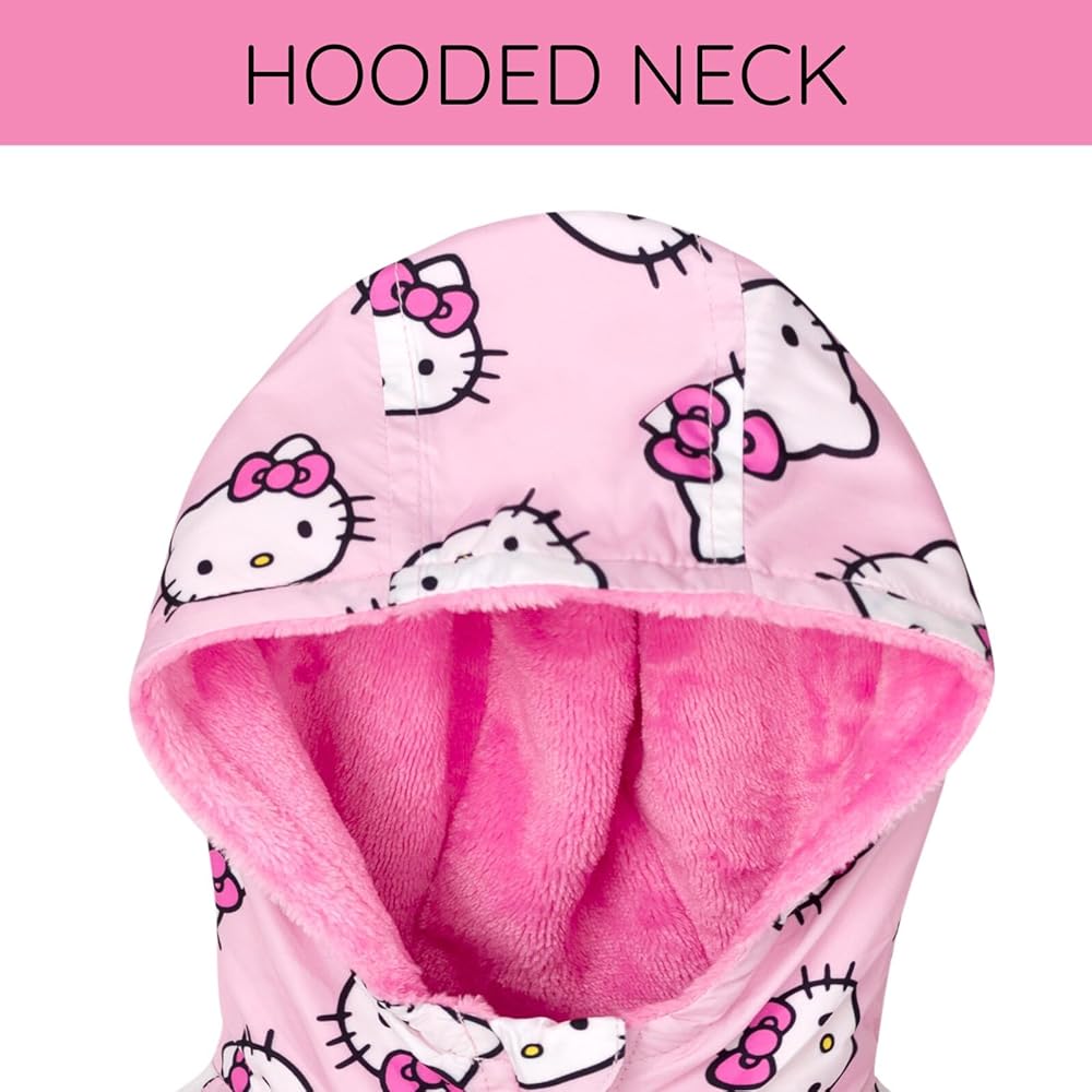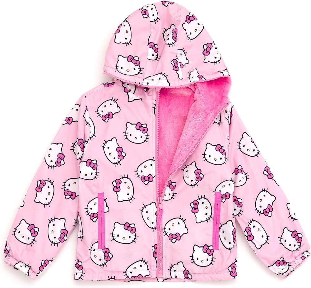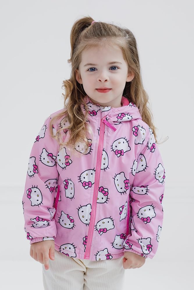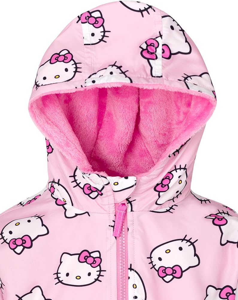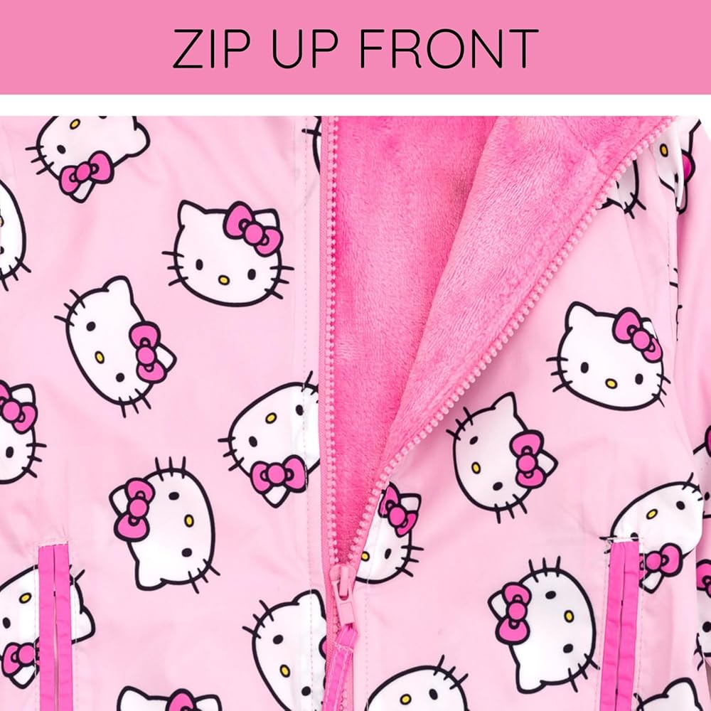 Your Hello Kitty fan is ready for a fun day with her favorite cartoon cat in this adorable Hello Kitty zip-up windbreaker! This cozy long sleeve jacket features a plush lining, convenient pockets, elastic sleeve cuffs and hem for a secure fit on those windy days, and a cute all over print of Hello Kitty that your little girl will love to wear! Soft and stylish, this comfortable Hello Kitty hooded coat is made for all day adventure and play!
