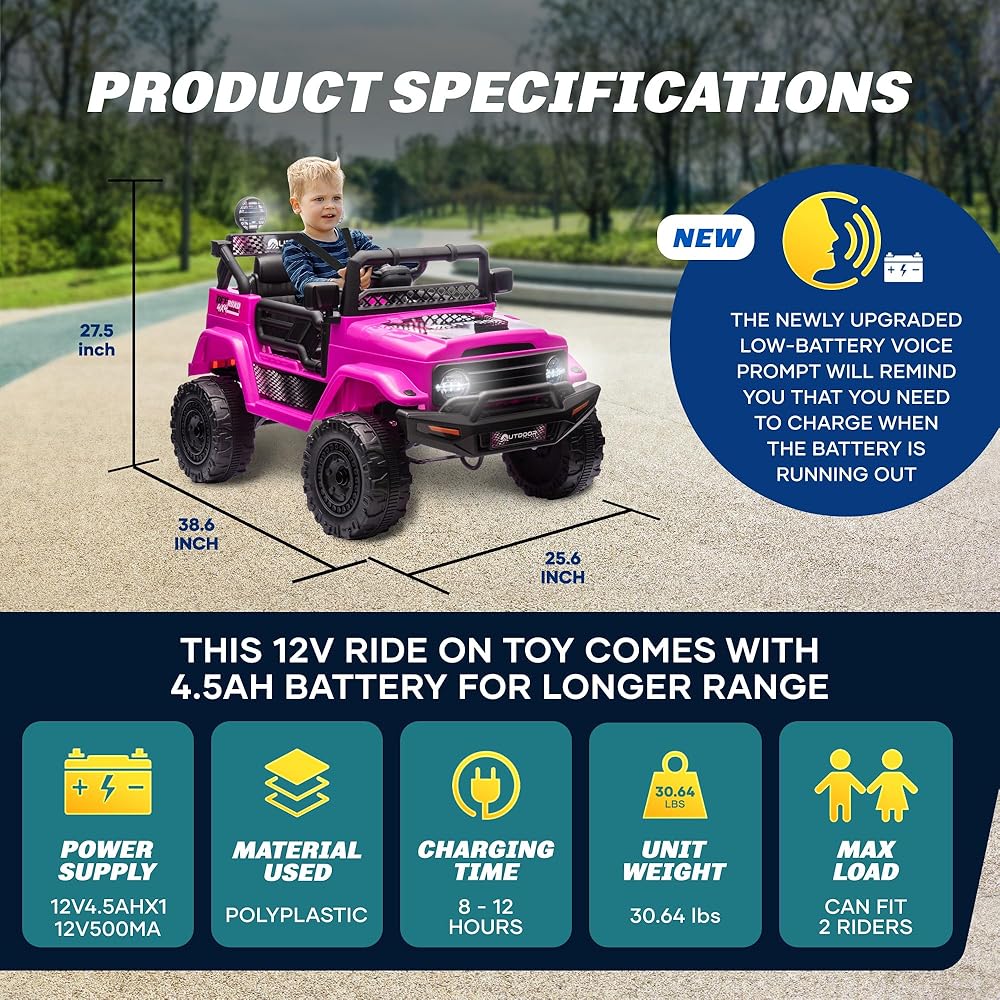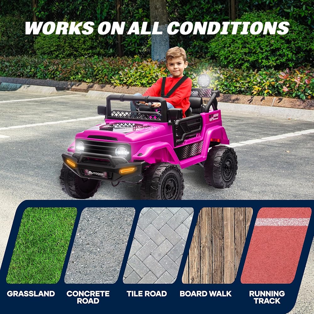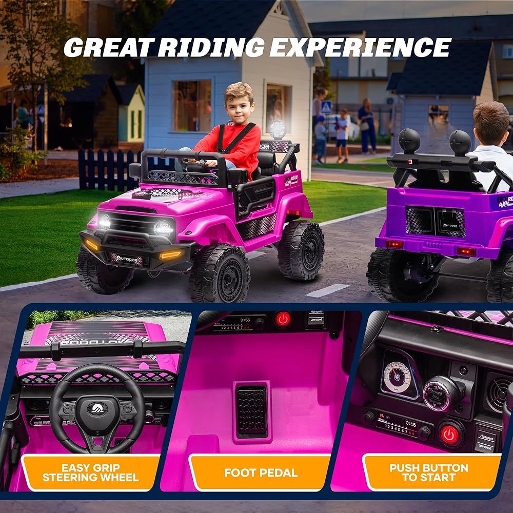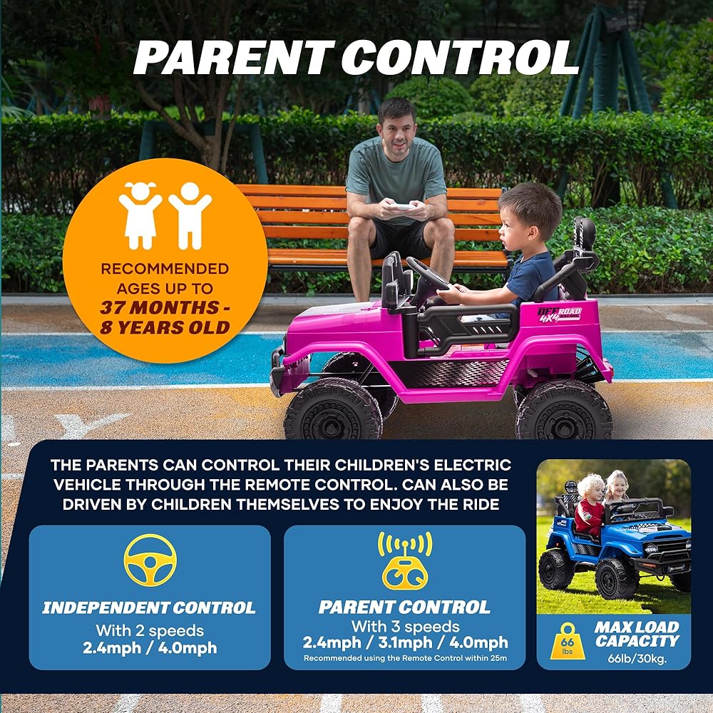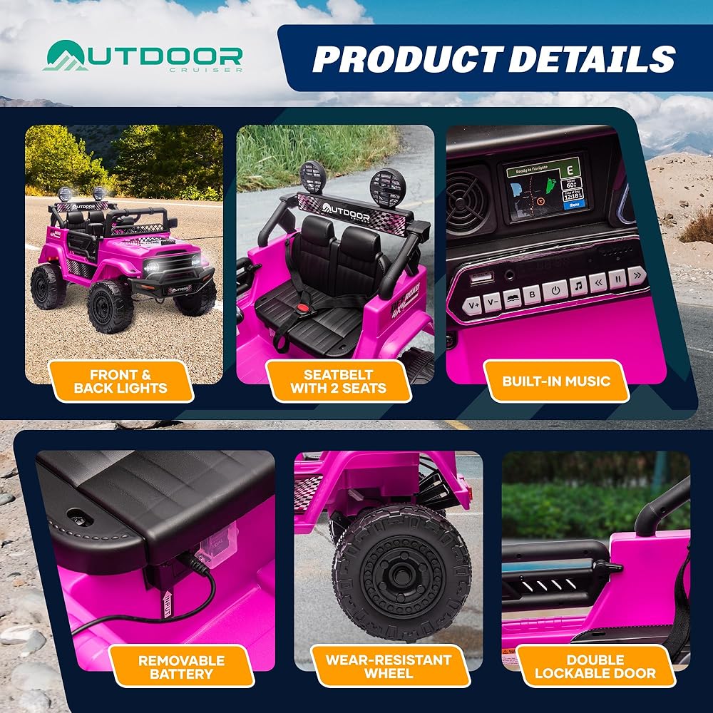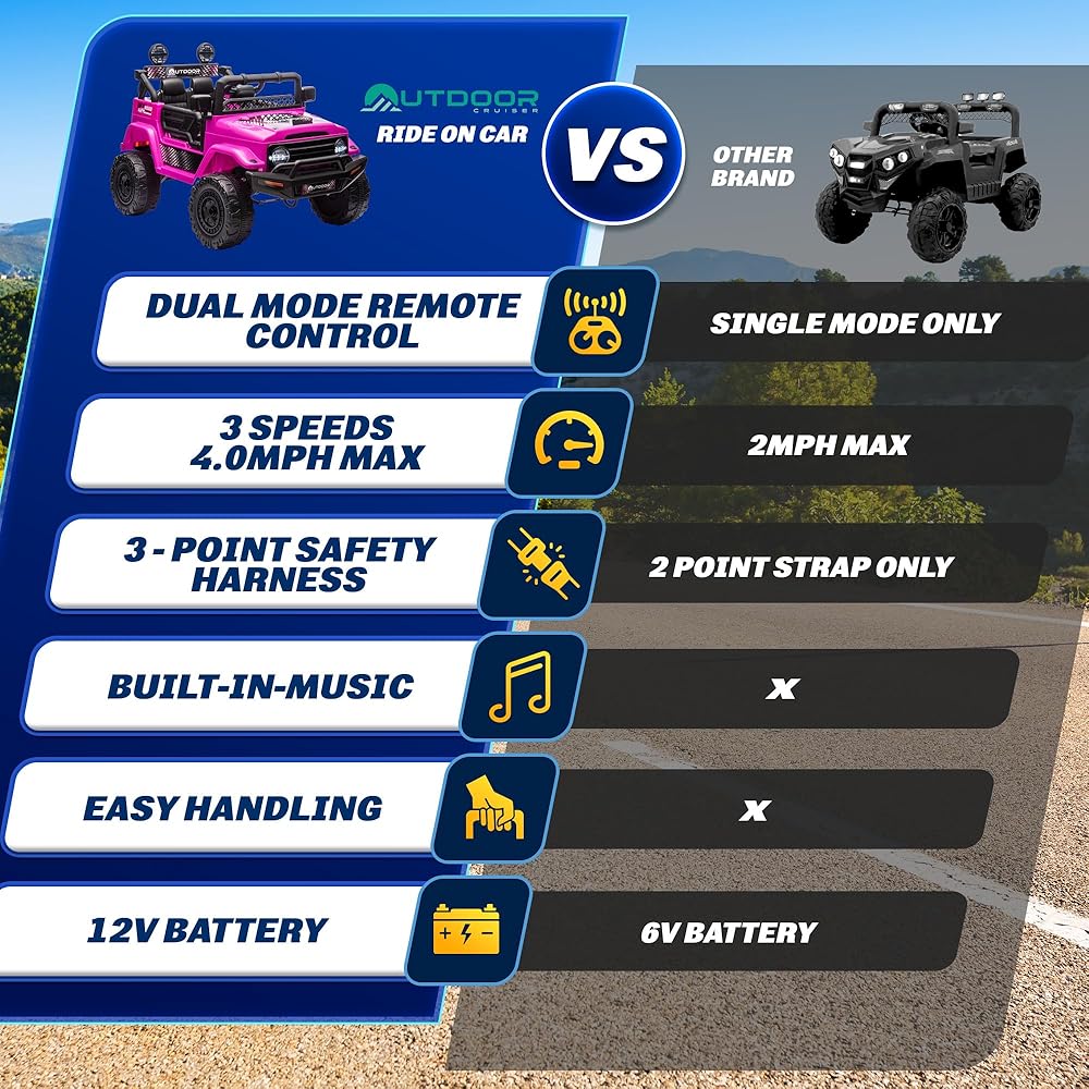 Embark on exciting outdoor escapades with the Outdoor Cruiser 12V Kids Ride-On Car, meticulously crafted to deliver exhilarating yet safe driving experiences for children aged 37 months to 8. Equipped with a robust 12V 4.5AH rechargeable battery, this ride-on car guarantees prolonged playtime, while the innovative low-battery voice prompt ensures timely recharges, eliminating unexpected interruptions during play. Charging the battery to full capacity takes approximately 8-12 hours, enabling extended adventures and endless fun. Harnessing cutting-edge technology, parents can effortlessly oversee their child's journey with the advanced 2.4G remote control system, offering precise maneuverability with three adjustable speeds (2.4/3.1/4.0mph). Alternatively, young drivers can seize control and explore independently with two-speed options (2.4/4.0mph), fostering a sense of empowerment and instilling essential driving skills from a young age. Safety remains paramount with an array of features designed to safeguard young riders. From the reliable seat belt and double lockable doors to the soft start function, ensuring gradual acceleration, and the emergency stop button for immediate halts, every aspect of this ride-on car is meticulously engineered to prioritize the well-being of children, providing parents with peace of mind during each adventure. Conquer any terrain with confidence, thanks to the ride-on car's robust spring suspension and dual 25W motors, facilitating smooth navigation across various surfaces, including grassy lawns, gravel pathways, and uneven pavements. This ensures a comfortable and enjoyable ride for young adventurers, whether they're exploring the backyard or cruising through the neighborhood. Crafted from durable materials, including high-quality PP plastic, this ride-on car exudes durability and reliability, withstanding the rigors of outdoor play and ensuring long-lasting enjoyment for years to come. With dimensions measuring 98x65x70CM and a weight of 30.64lbs, this ride-on car strikes the perfect balance between stability and maneuverability, making it an ideal choice for young drivers seeking thrilling adventures and unforgettable memories. Promote active play and foster a love for exploration with the Outdoor Cruiser 12V Kids Ride-On Car, a versatile and feature-packed vehicle that seamlessly blends safety, functionality, and excitement.