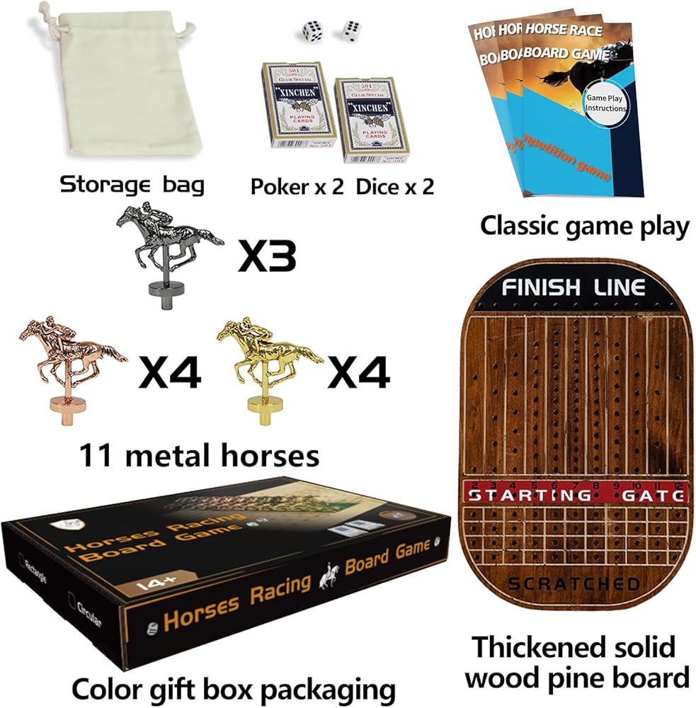 سهلة اللعب: لعبة لوحة سباق الخيل سهلة التعلم ومناسبة للاعبين من جميع الأعمار ومستويات المهارة. يختار كل لاعب حصانًا ويستخدم النرد لتحريك حصانه على طول المسار. أول شخص يصل إلى خط النهاية يفوز. الأمر بهذه البساطة! يمكن لهذه اللعبة أن تستوعب ما يصل إلى 11 لاعبًا ويبلغ حجم رقعة الشطرنج 16.1 × 10.8 × 0.6 بوصة. تتضمن إجمالي 11 حصانًا: 4 ذهبيات و4 ذهبية وردية و3 فضية، بالإضافة إلى 4 نرد و2 صندوق بوكر وحقيبة حصان وتعليمات اللعب.
