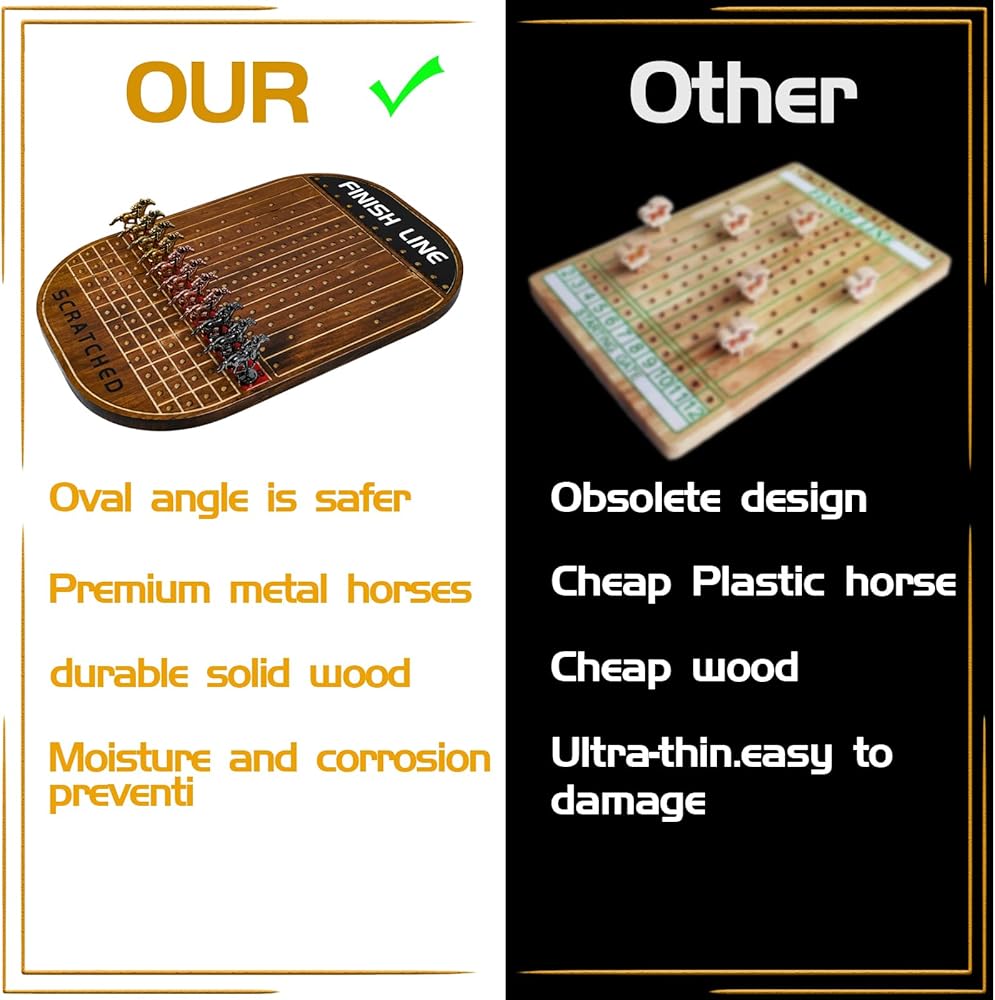 حصان معدني، وليس من البلاستيك: يتم تحقيق سباق الخيل النابض بالحياة باستخدام معدن نقي بدلاً من البلاستيك الرخيص وسهل التلف. لوحة اللعب هذه مصنوعة من خشب صلب عالي الجودة ويبلغ سمكها 0.8 بوصة، وهي ليست جميلة فحسب ولكنها متينة أيضًا. يتميز الجزء الخارجي من لوحة اللعبة بطبقة خاصة مقاومة للماء تمنع التشوه أو التآكل. الزوايا الناعمة أكثر أمانًا لمنع الاصطدامات والإصابات!