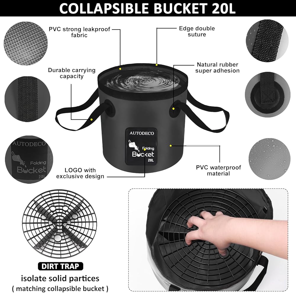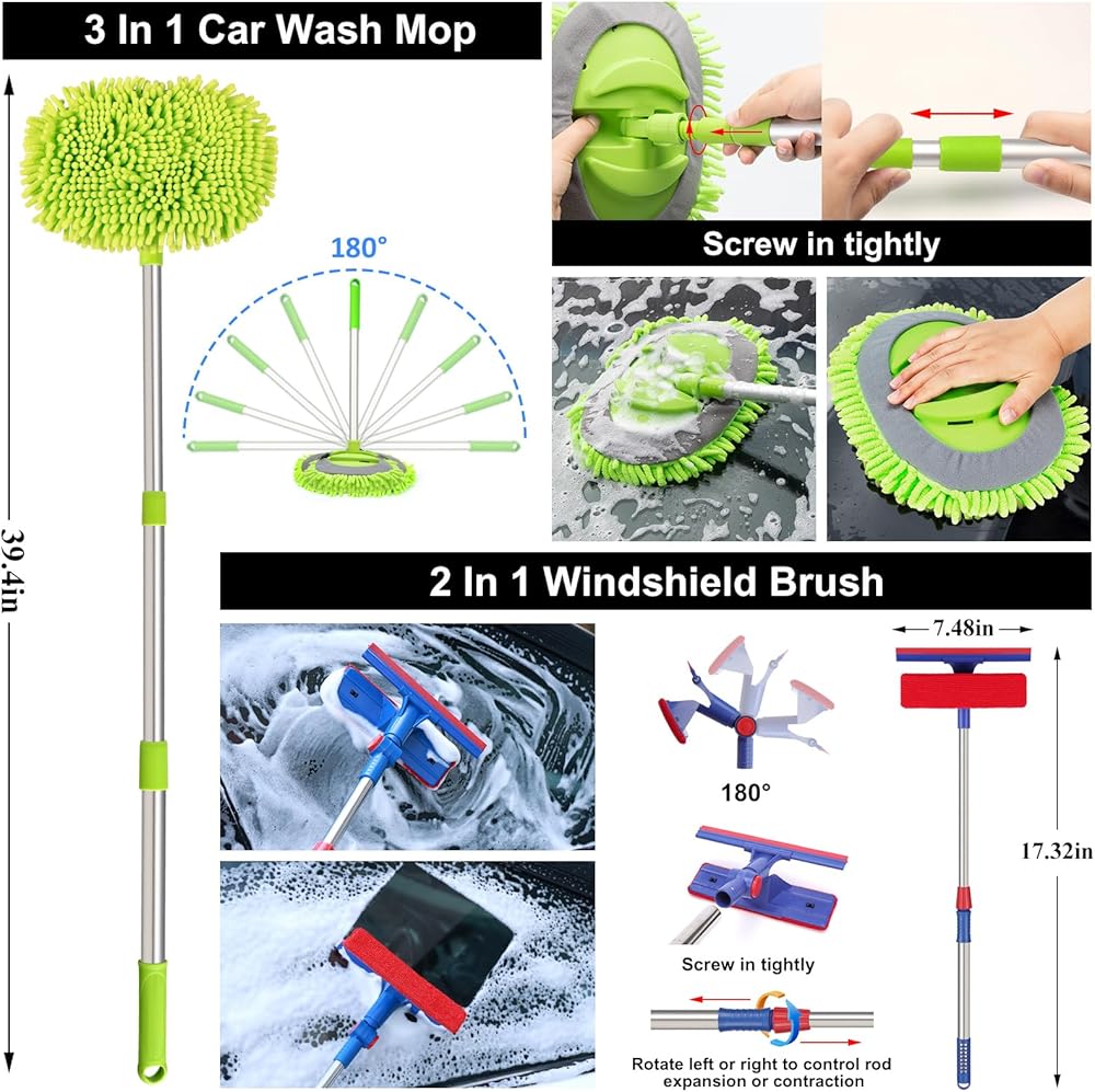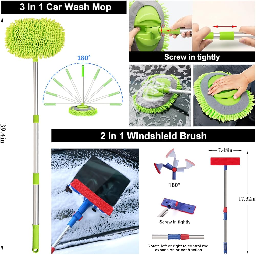 Premium Material: Other car cleaning tools are made of soft, durable materials that won't shed lint or leave marks on the car's surface. Absoulately safe to clean on delicate surfaces. Gentle on paint while tough on grime or dirt. The 2-in-1 windscreen brush with 180° swivel head and extra-long telescopic handle cleans windows and removes water spots with ease. 5 gallon collapsible bucket can meet car washing anywhere. A piece of solid detergent can dissolve 4 liters of water