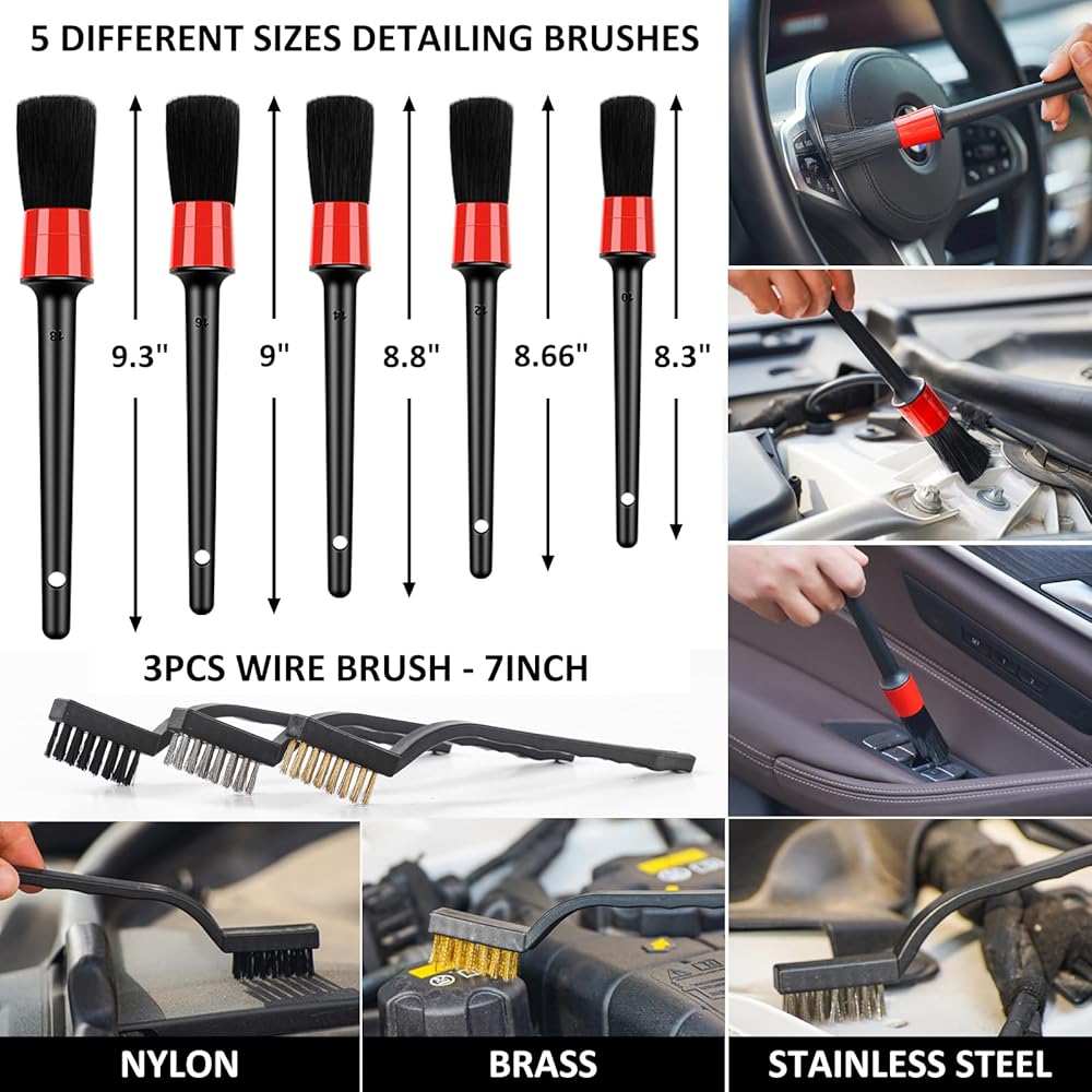 Car Detailing Kit: Disposable crevice cleaning brushes thoroughly clean your car's tight crevices and come with 10 replacement heads for added convenience with no cleaning required after use. The large interior brush features a non-slip streamlined design that's perfect for cleaning your car's interior, and the complete tyre cleaning kit helps to clean tyres and wheels quickly. 5 detailing brushes and other kind of brushes, meet all you need of car detailing or cleaning