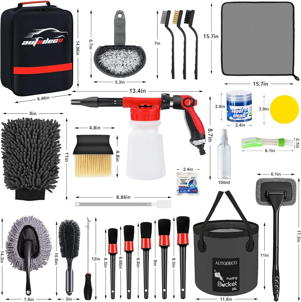 AUTODECO 44Pcs Car Wash Detailing Kit Cleaning Kits with Foam Gun Sprayer Wash Mop with Long Handle Collapsible Bucket Large Wash Mitt Towels Complete Interior Exterior Car Washing Supply Set Black