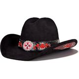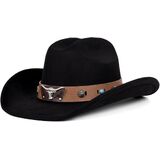 - 1. Authentic western style embodied in the Kalerona black cowboy hat with silver metal bull head emblem and silver stud accent hat band.