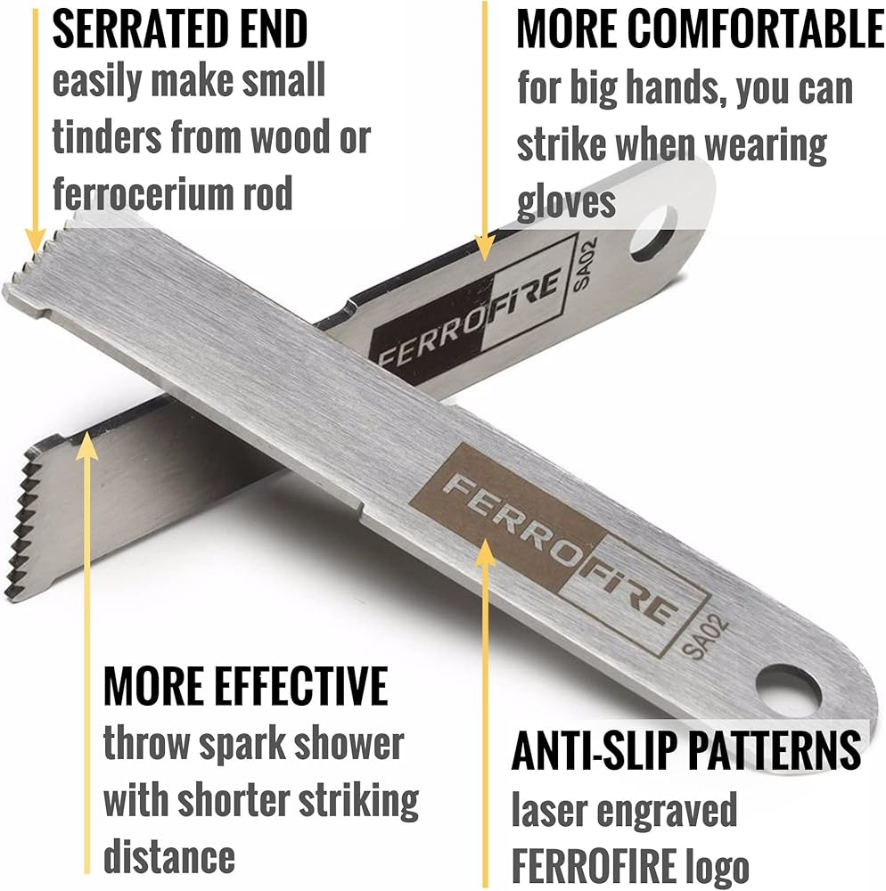 SERRATED SHARP SCRAPER – Superb carbon steel ferro rod striker SA02 is decent, with four sharp strike edges for left hand and right hand use, has sharp teeth to grind off some of the magnesium and wood shavings. The edges are nice and sharp for a good, beefy spark. It throws them very nicely.