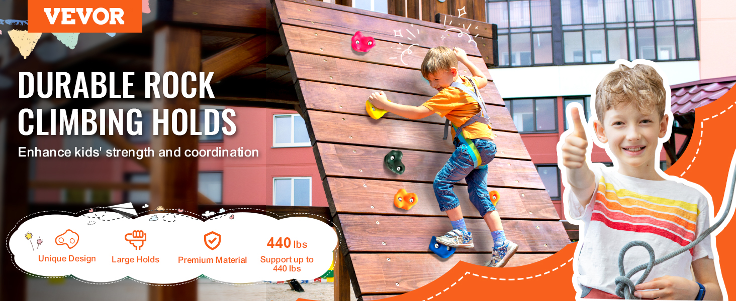 Large, Easy-to-Grip Holds: The climbing wall grips come in various sizes. Their unique anti-slip textured surface makes them easy to grip and step on, providing a safe and comfortable hold for children while climbing. This activity helps improve children's hand-eye-foot coordination, develops their sense of balance, enhances concentration, and builds confidence and courage.