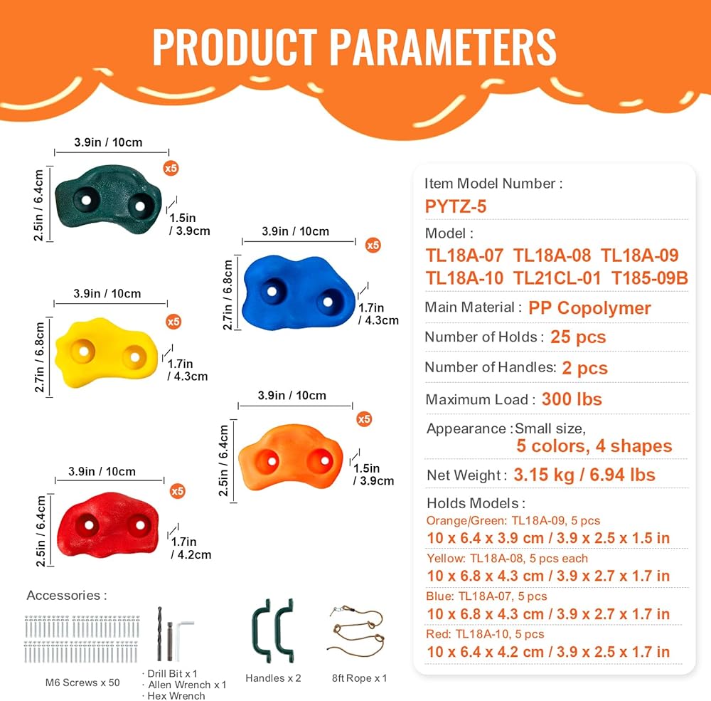 Safe, Durable, and Stable: Made from high-quality PP copolymer, our climbing holds are durable and wear-resistant. With the included hardware and screws, these holds are incredibly sturdy, supporting weights up to 230 lbs for both kids and adults. These weather-resistant rocks provide reliable strength, preventing slips and making climbers feel as secure as being on their dad's shoulders.