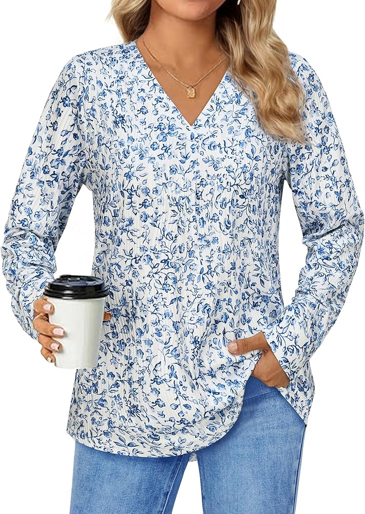 Elegant Wave Design - Textured Pattern Representing strength and resilience, Women's V Neck Long Sleeved Tunic Shirt features a distinctive wave pattern that symbolizes the ability to navigate life's challenges with elegance. 2024 fashion blouses for women business casual,Wrok shirts for office wear.