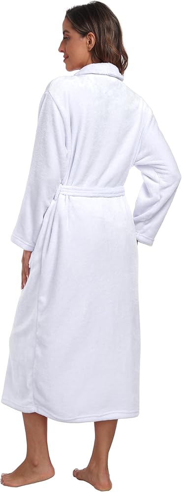 Shawl Collar Plush Bathrobe: The soft bathrobe features shawl collar, mid calf length, long sleeves, an inner tie and adjustable waist belt to keep firmly. Two front pockets can put cell phone, keys, wallet and other small objects things, very convenient in daily life