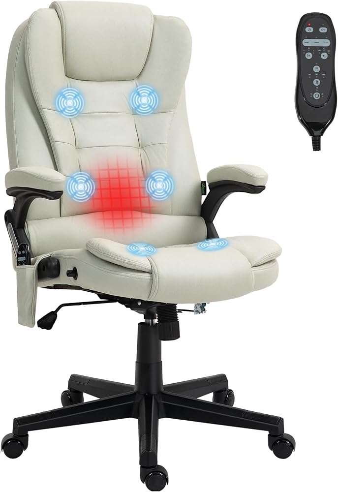 HOMCOM 6 Point Vibrating Massage Office Chair with Heat, Microfiber High Back Executive Office Chair with Reclining Backrest, Padded Armrests and Remote, Beige