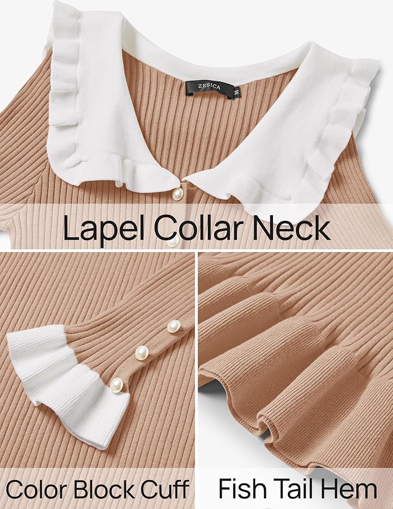 Features: Long sleeve midi dresses for women, ribbed knit dress, lapel collar neck dress, slim fit bodycon dress, button dress, fall sweater dresses, wedding guest dresses, cocktail dresses for women, winter dresses, fish tail dresses, contrast color at cuff and collar dresses.