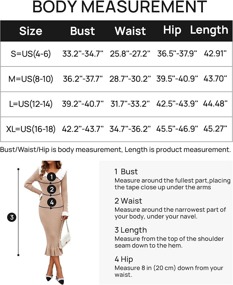 Size Guide: S=US 4-6, M=US 8-10, L=US 12-14, XL=US 16-18. TIPS: Please refer to the size chart before ordering. This sweater dress is made of soft and stretchy fabric, which will give you a comfortable wearing experience!