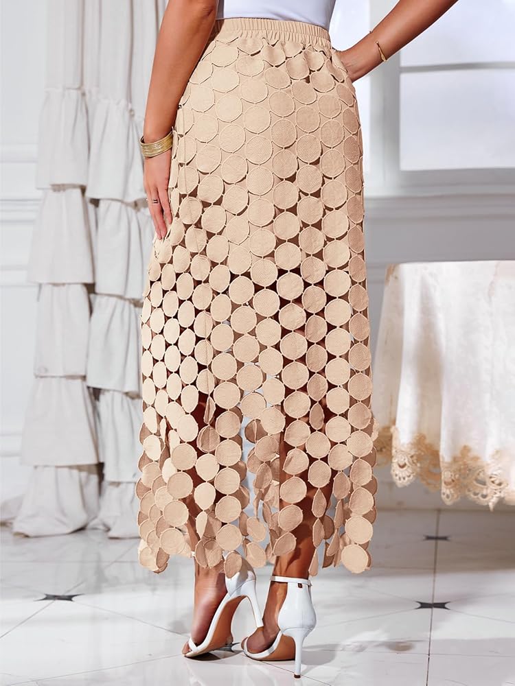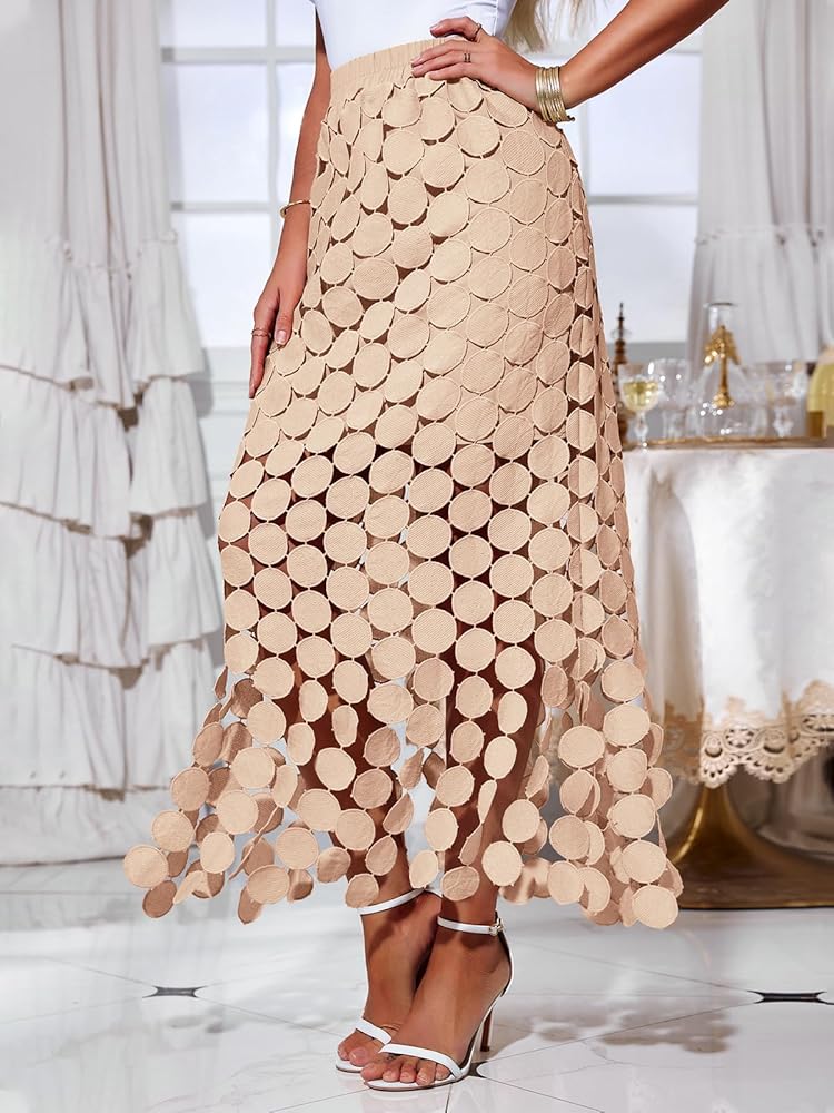 【What Material We Use】: Crafted from a delicate blend of premium fabrics, this Women's Hollow Out Maxi Skirt is a fusion of comfort and style. Complementing the airy exterior, a soft, skin-friendly polyester lining ensures modest coverage while maintaining a gentle feel against the skin. The fringe hem, made from fine synthetic fibers, sways gracefully with each step, infusing movement and a bohemian flair into the design.