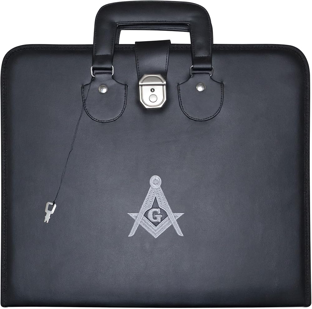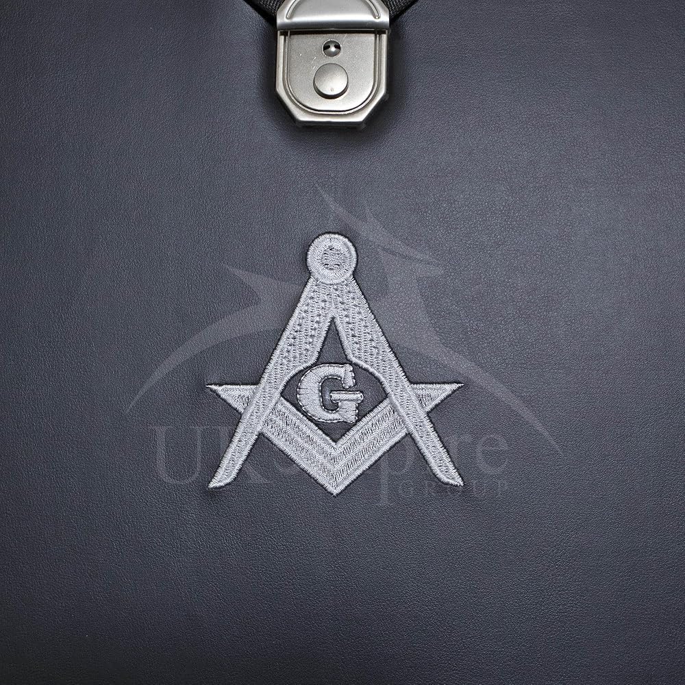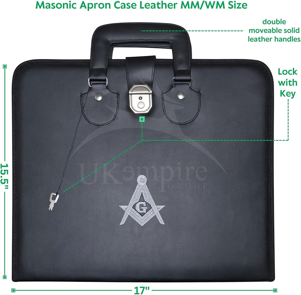 Discover our Premium Quality Masonic Master Mason Apron Case, crafted from premium black imitation leather. Comes with a moveable handle, front lock and key for added protection. Machine embroidered MM emblem. Inside soft padded blue fabric lining, along with elastic straps and connector in the top compartment to securely hold your regalia aprons. The bottom part features two spacious pockets, one with zipper openings for additional storage. Size: at 17'' x 15.5'' x 1.5” suitable MM/WM and Provincial aprons.