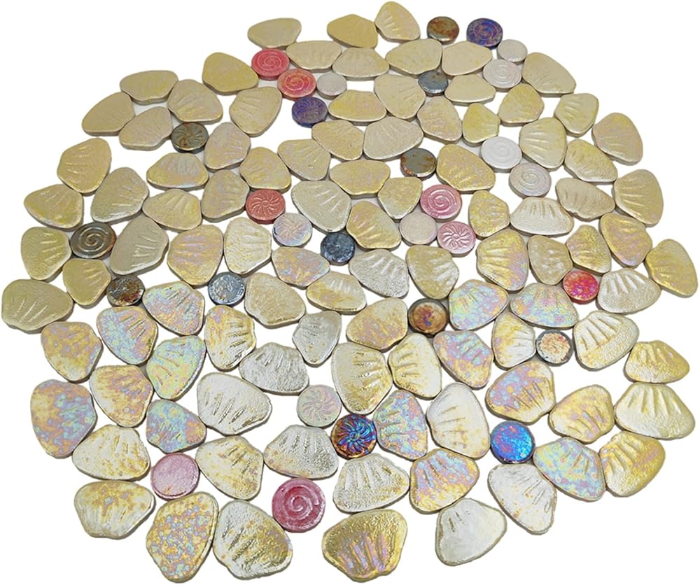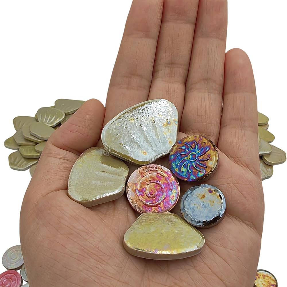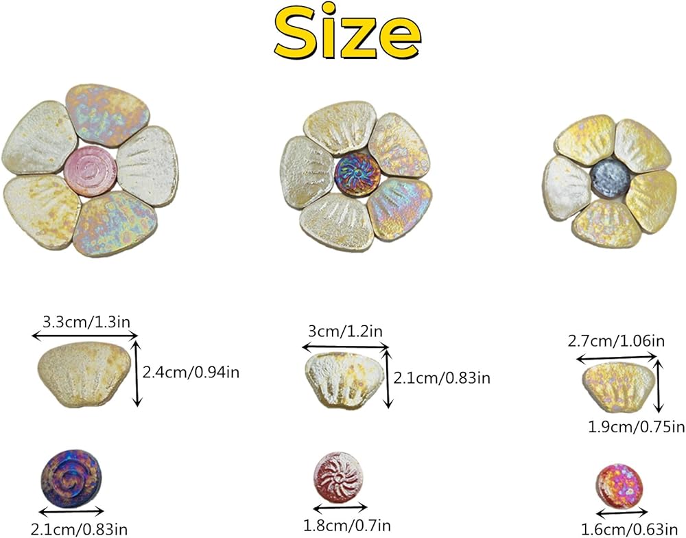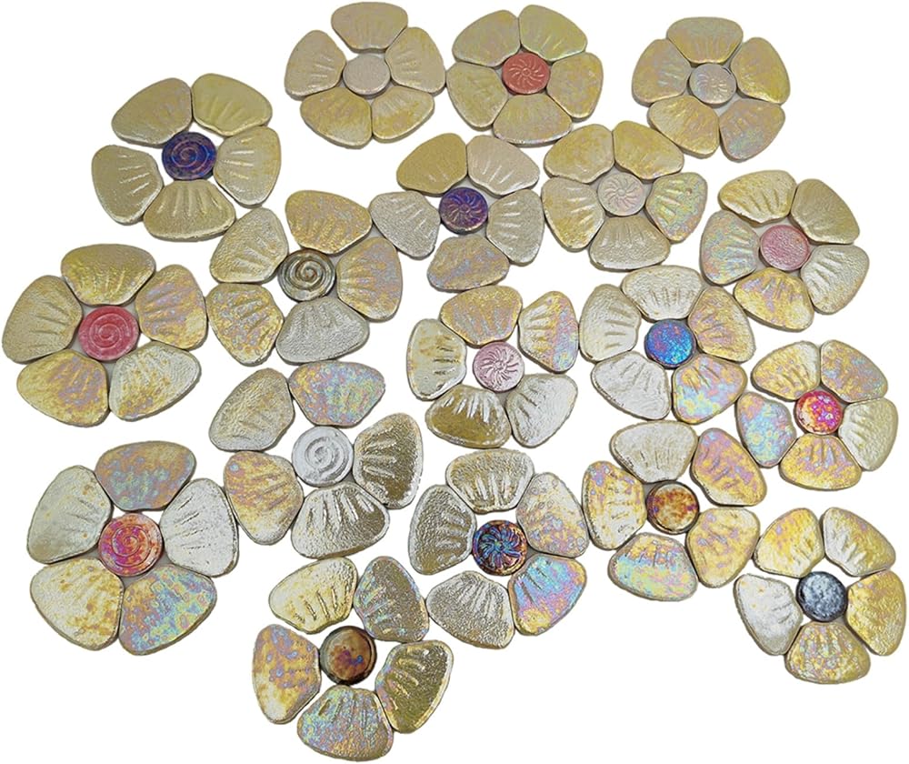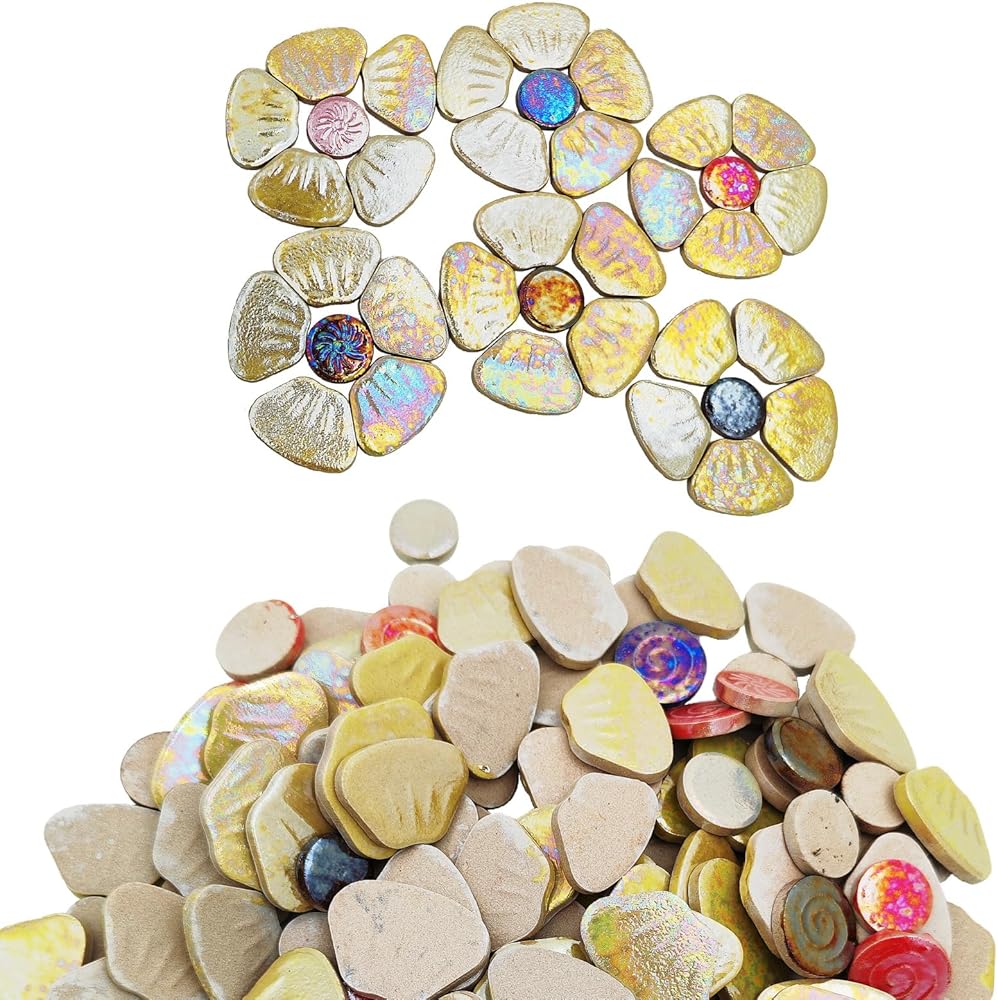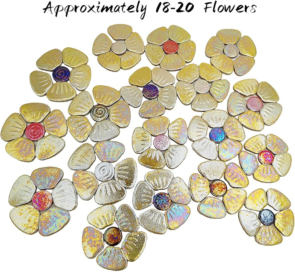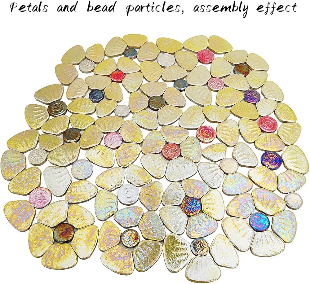 Package included: 1.1lb/500g of Flower Ceramic Mosaic Tiles packed in a PP bag, roughly can be assembled into 18-20 flowers. Due to the Iridescent ceramic mosaic tiles, the colours are different from every angle.