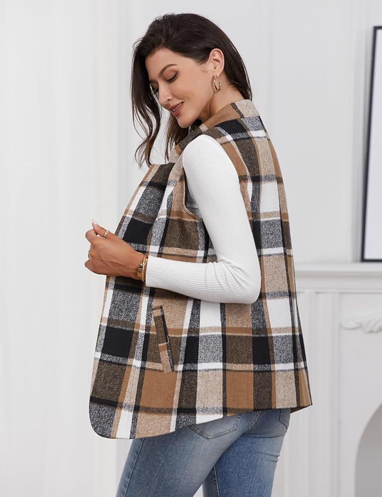 IDEALSANXUN womens plaid vest wool fall winter sleeveless blazer jackets casual trench coat waistcoat open front cardigan tops office outfits