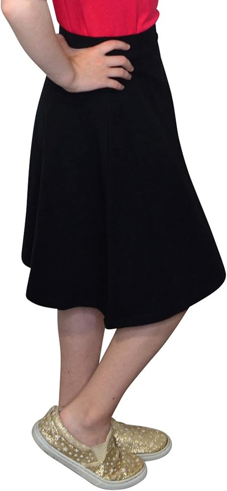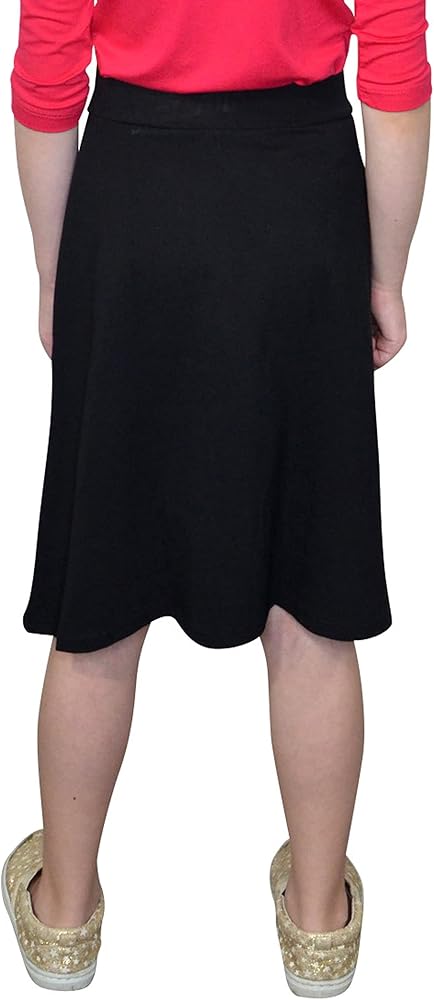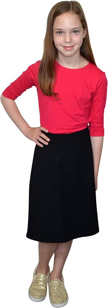 This classic style has been designed in a lightweight, soft cotton stretch knit fabric with gentle stretch that will work for your girl at school, home and dress up. The pull-on waistband is made of the same material as the rest of the skirt. The aline cut flatters her figure and the length gives you the modesty you seek. Unlined. No pockets. Imported. Machine was cold.