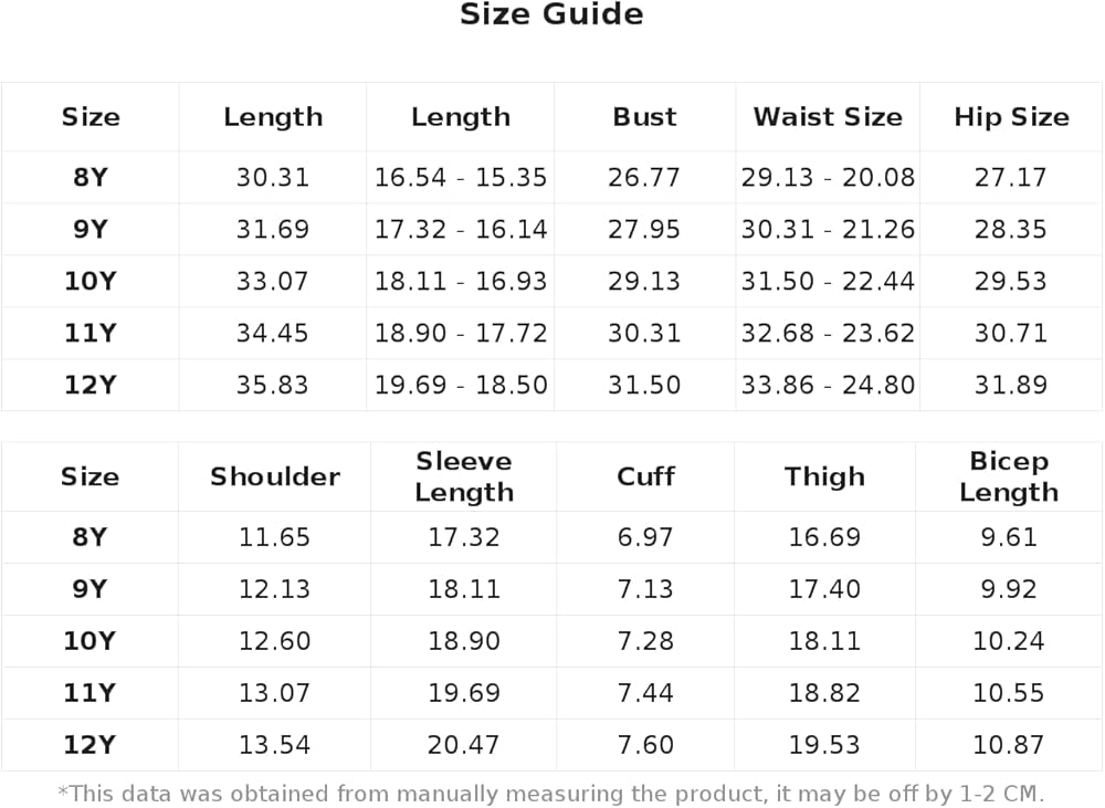 8Y:Hip Size:26.4IN,Length:30.9IN,Thigh:15.7IN,Waist Size:29.9-20.9IN,Bicep Length:9.0IN,Bust:25.2IN,Cuff:7.0IN,Length:14.4/15.4IN,Sleeve Length:17.3IN