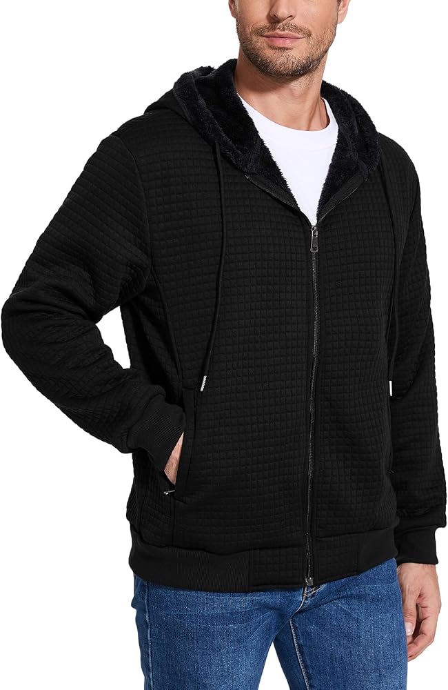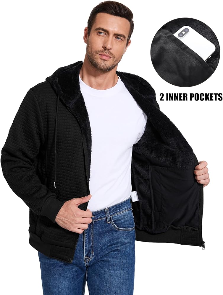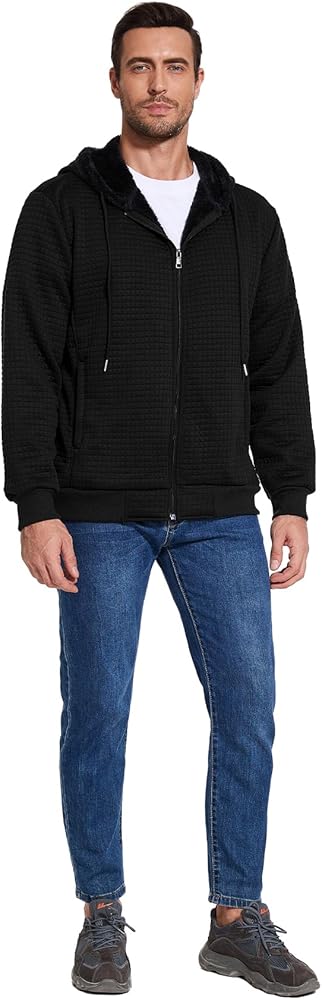 Mens Hooded Jacket Unique Design: Roomy hoodies with adjustable drawstring, 2 side zipper pockets, 2 inner deep pockets, full zip-up design, rib cuffs and bottom band with spandex or enhanced stretch and recovery, faux fur with no shedding or losing fibers, feels thermal and silky.